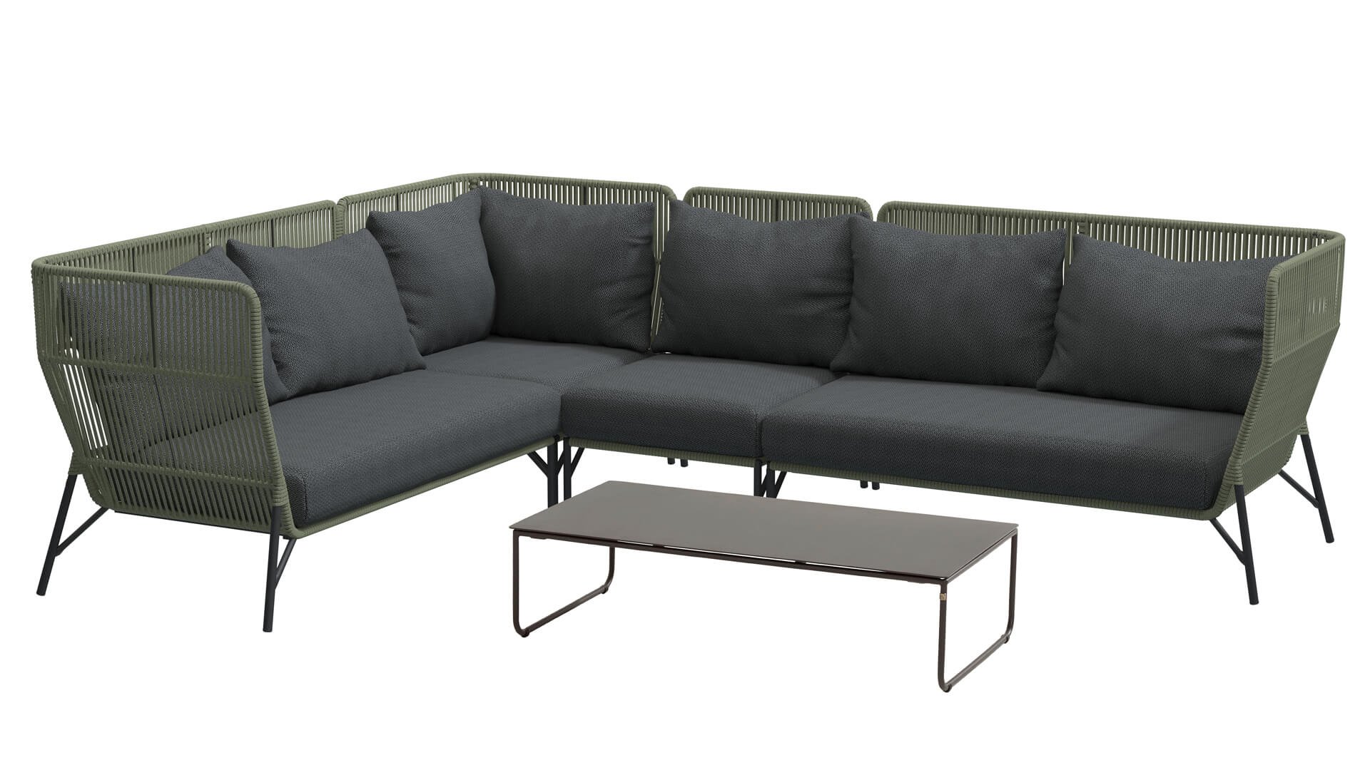 De 4SO modulair Altoro loungeset heeft door zijn extra hoge rugleuning een mooie uitstraling en het geeft een geborgen en cosy gevoel. De Altoro loungeset is afgewerkt met groen rope, wat een schitterend contrast geeft met het donker antraciete frame en kussens.