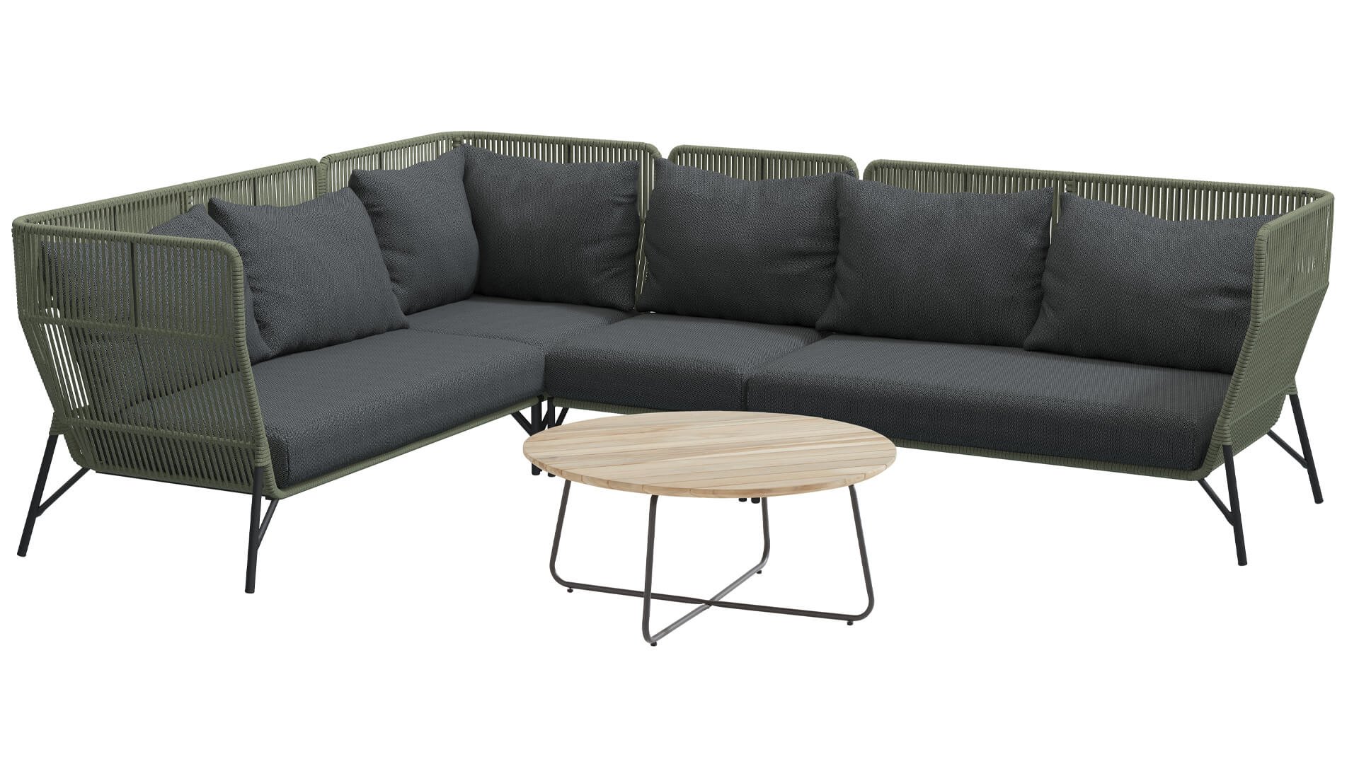 De 4SO modulair Altoro loungeset heeft door zijn extra hoge rugleuning een mooie uitstraling en het geeft een geborgen en cosy gevoel. De Altoro loungeset is afgewerkt met groen rope, wat een schitterend contrast geeft met het donker antraciete frame en kussens.