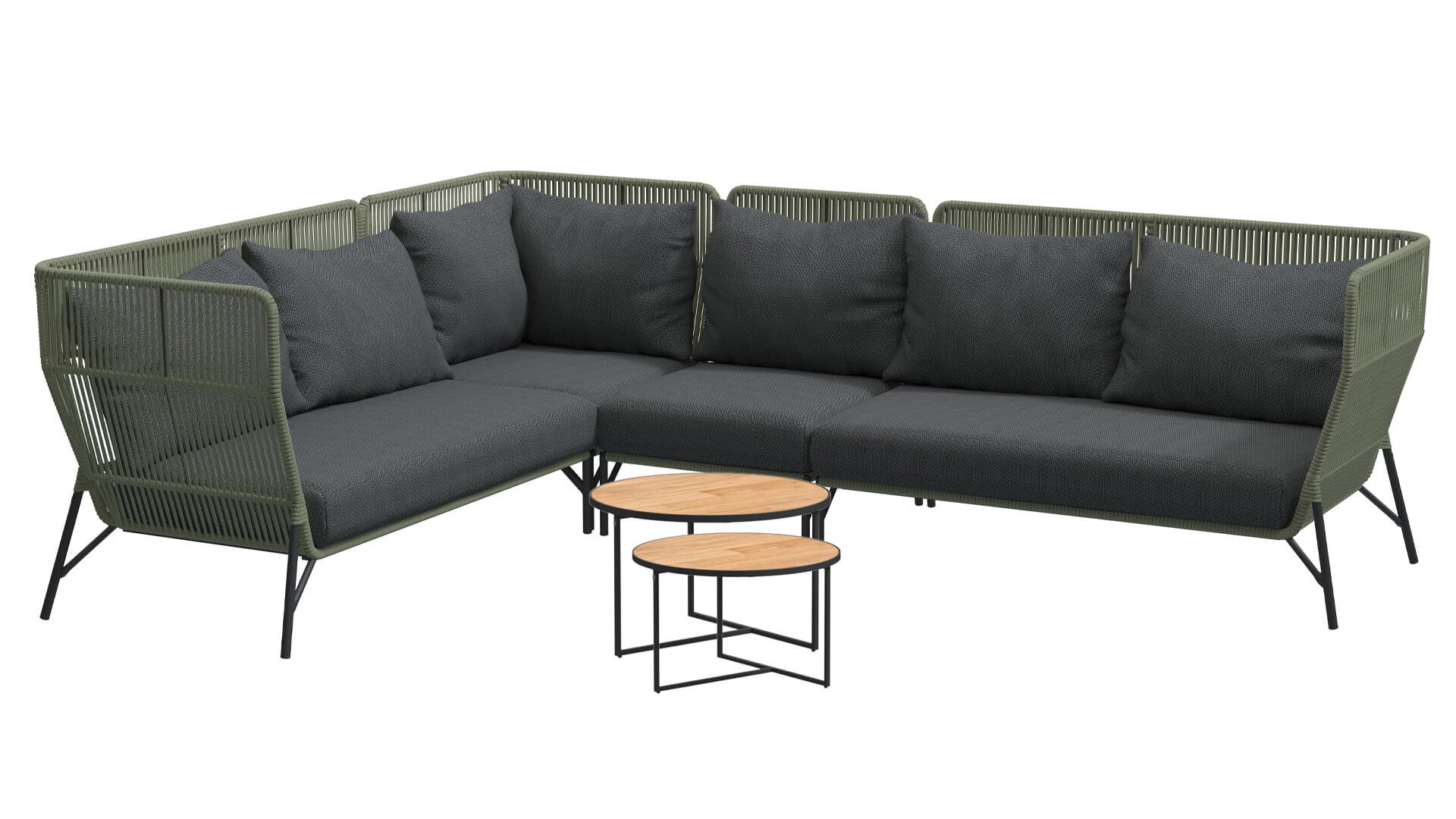 De 4SO modulair Altoro loungeset heeft door zijn extra hoge rugleuning een mooie uitstraling en het geeft een geborgen en cosy gevoel. De Altoro loungeset is afgewerkt met groen rope, wat een schitterend contrast geeft met het donker antraciete frame en kussens.