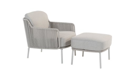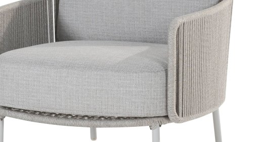 Bernini komt van het merk 4 Seasons Outdoor. Het frame is gemaakt van gepoedercoat aluminium. De stoel is voorzien van all weather touwen. Het Rope kan altijd buiten blijven staan zonder stof aan te trekken. Staat het kussen niet op de stoel, dan ziet de stoel er prachtig uit. Het zitkussen is licht grijs. Er is olefinestof gebruikt. Dit is een niet-vervagende stof. Deze stof is ook weerbestendig. De 4 Seasons Outdoor loungestoel Bernini is een mooi gevormde stoel. De ronde vorm en het zachte kussen maken het tot een comfortabele stoel. Dit nieuwe product in de 4 Seasons Outdoor-serie is verkrijgbaar in twee kleuren: Frozen en Platinum. De Bernini loungestoel zorgt voor een uitstekende ondersteuning van de rugleuning van de stoel, en is perfect te combineren met verschillende salontafels! Het merk 4 Seasons Outdoor produceert producten van de hoogste kwaliteit.