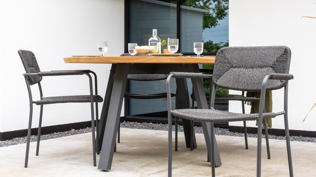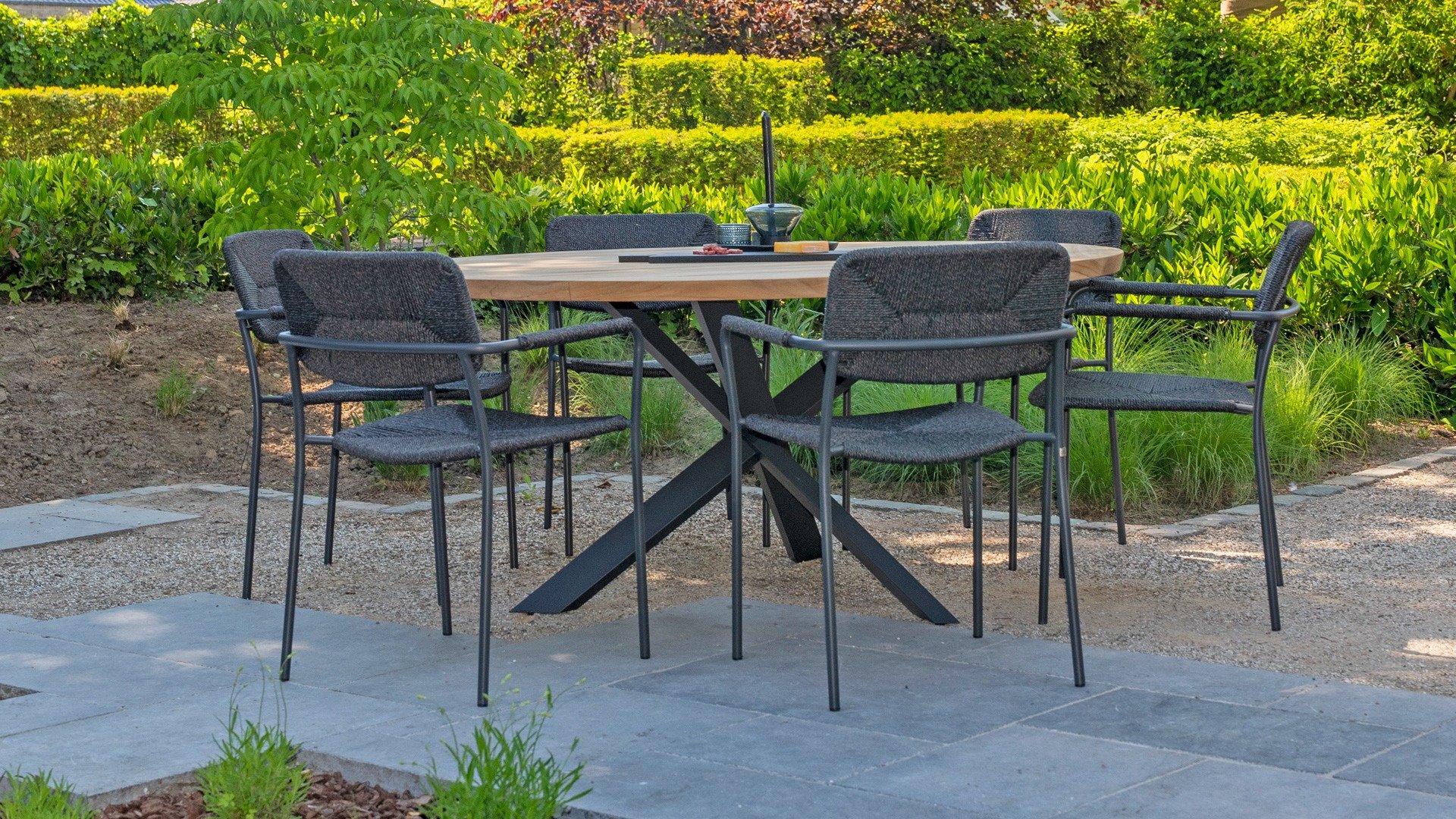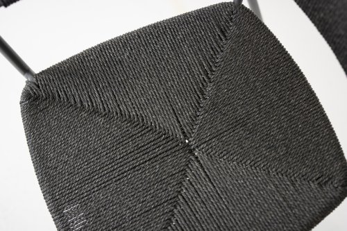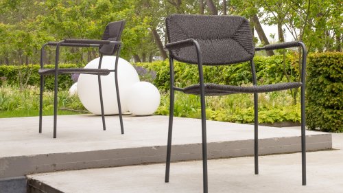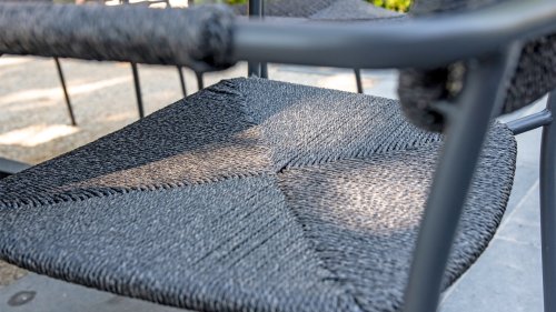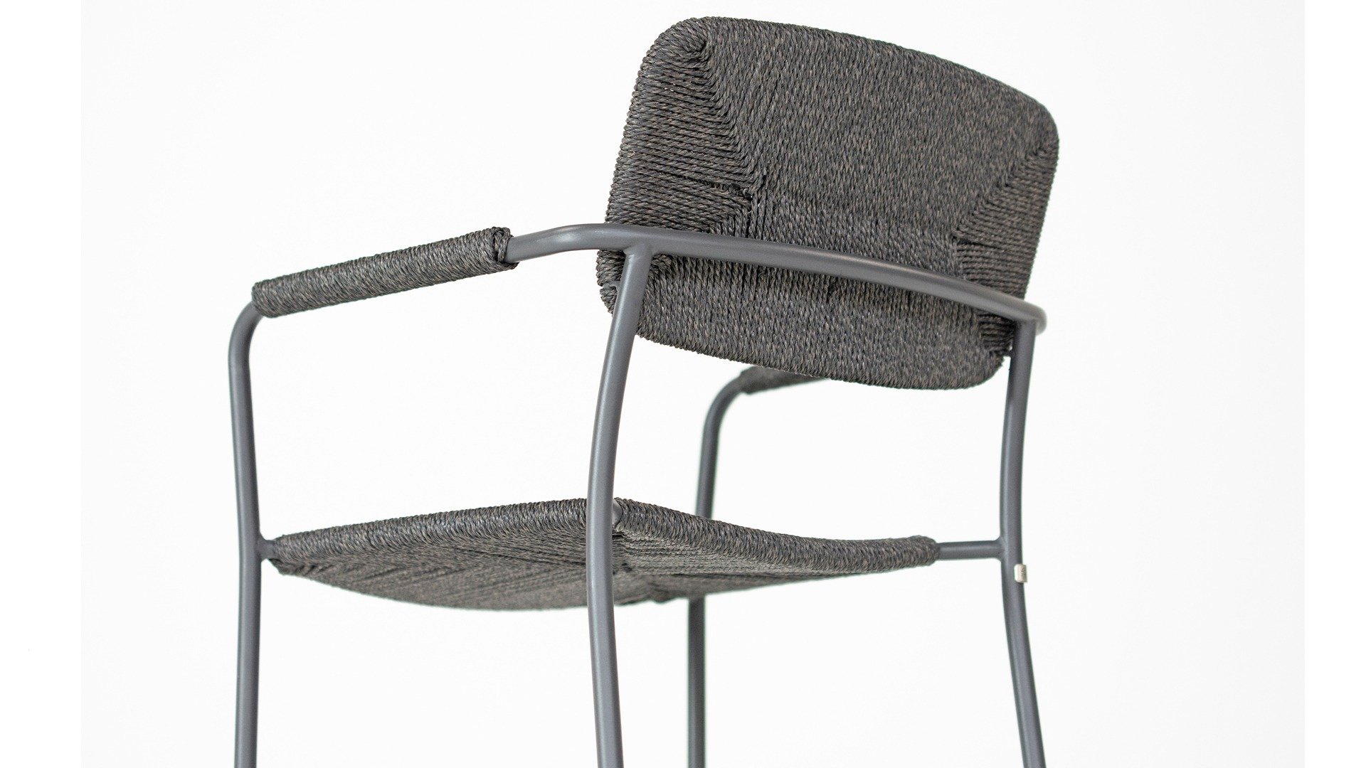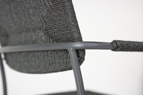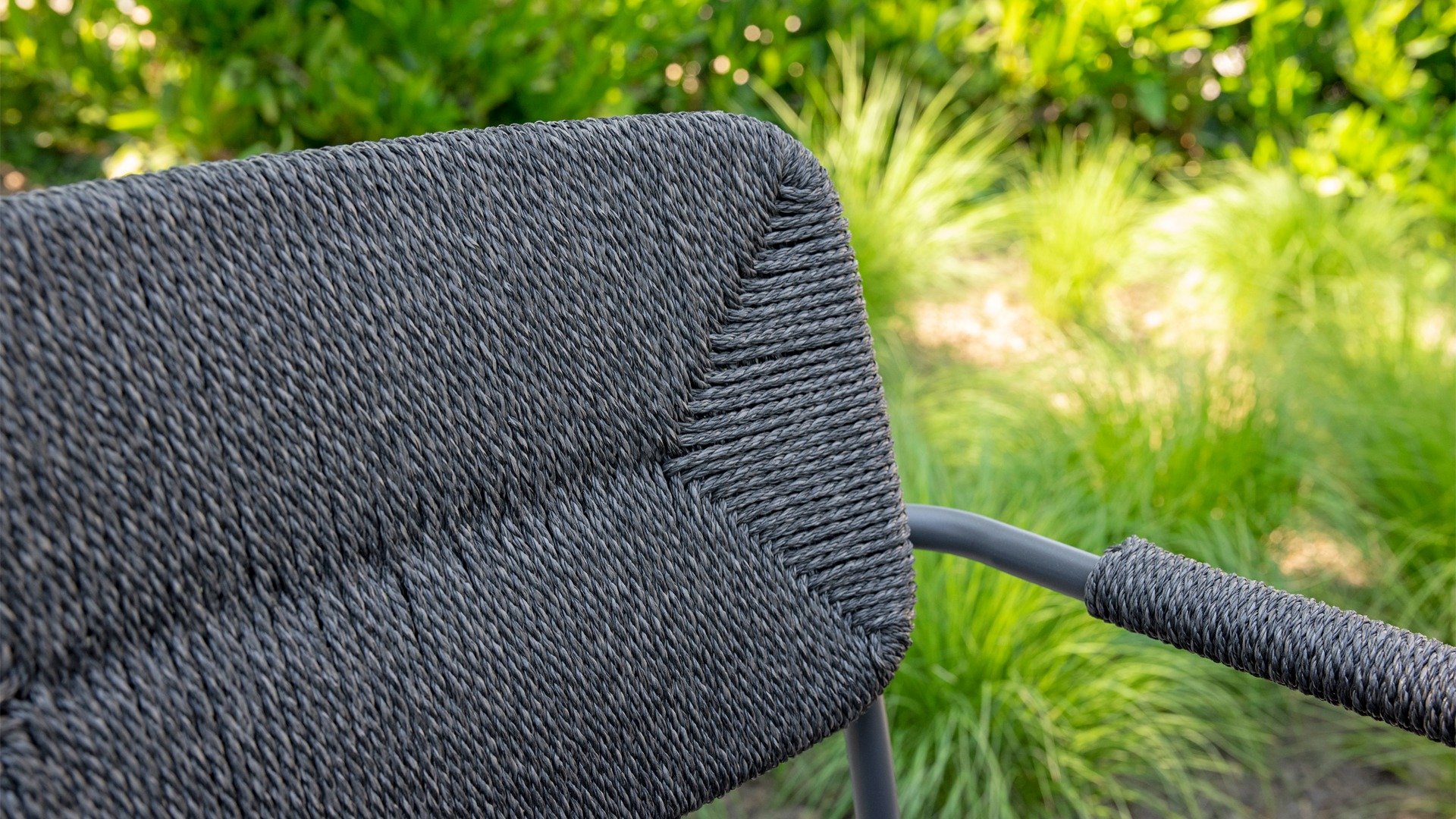 Het antraciet frame van RVS heeft een sterke maar minimale en industriële look door de dunne ronde buizen. De afgeronde hoeken geven het nog steeds wel een vriendelijk karakter. Het materiaal van de Bora stoel is uniek in onze collectie. Het is een gedraaide vlechtwerk-draad. Het geeft de Bora stoel een natuurlijk touw-achtig uiterlijk. Zowel de zitting als de rugleuning is gemaakt van dit materiaal en ook de armleuning zijn omwikkeld met hetzelfde vlechtwerk.