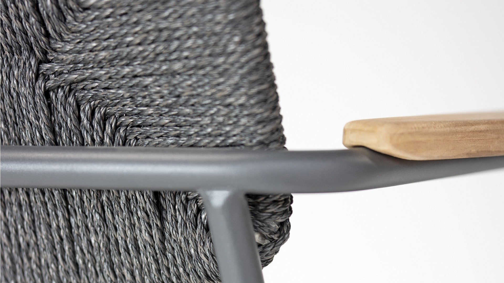 Het antraciet frame van RVS heeft een sterke maar minimale en industriële look door de dunne ronde buizen. De afgeronde hoeken geven het nog steeds wel een vriendelijk karakter. Het materiaal van de Bora stoel is uniek in onze collectie. Het is een gedraaide vlechtwerk-draad. Het geeft de Bora stoel een natuurlijk touw-achtig uiterlijk. Zowel de zitting als de rugleuning is gemaakt van dit materiaal en ook de armleuning zijn omwikkeld met hetzelfde vlechtwerk.