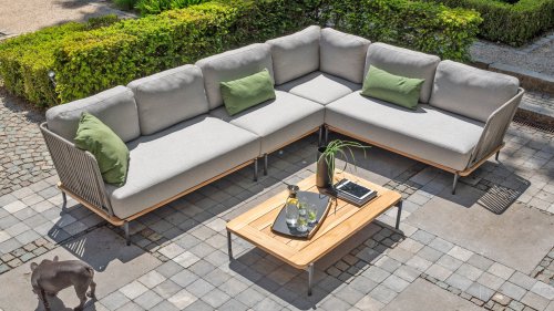 Hoekbank Castello van 4 Seasons Outdoor maakt gebruik van zachte, harmonieuze tinten en een aangenaam rond design. Super dikke, comfortabele kussens en warme teakhouten touch versterken het vertrouwde en warme imago van de bank. De 4 Seasons Outdoor Castello Lounge is een prachtige loungeset met lichtgrijze kussens en aluminium poten. Modulair, dus geschikt voor het opmeten van elke tuin.