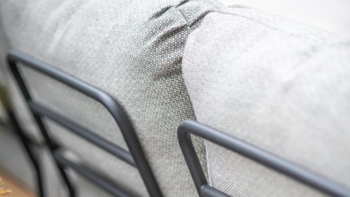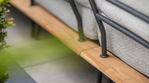 De fluffy gemêleerde kussens zijn weerbestendig en uitgevoerd in Olefin stof in de kleur Jute Grijs. De stof oogt stoer door de jute-achtige look, in combinatie met het teak en de design pootjes een echte eye-cathcer! Door het gebruik van Textileen bespanning onder de zitkussens zijn de kussens extra comfortabel! De luxe kussens hebben een afritsbare hoes van Olefin stof, deze is te wassen en drogen op 30 graden. Olefin is zeer UV bestendig en kan ook tegen regen, koude en warme temperaturen`.