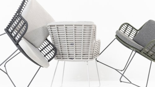 Het frame van de 4SO Fabrice Tuinset loopt strak en vloeiend in elkaar over en is afgewerkt met strak omvlochten Rope. Rug en zitting is gevlochten met dit sterke Rope en geeft een stevige maar comfortabele zit. Het frame vormt een speels en minimalistisch samenspel van vloeiende lijnen die samenkomen en weer uit elkaar gaan, een lust voor het oog!