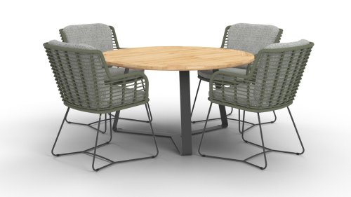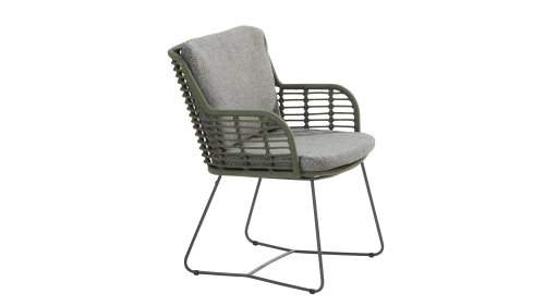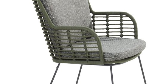 Het 4Seasons Fabrice frame is omvlochten is met Groen gekleurd synthetische wicker in de vorm van touw (Rope). De kussens zijn uitgevoerd in een prachtige grijs kleurige Olefin stof. Door de veerkracht van het Rope materiaal en de fijne kussens ontstaat een subliem zit-comfort! De kussens hebben een Olefin hoes welke af te ritsen is en uit te wassen op 30 graden. Deze stof is zeer weerbestendig en duurzaam