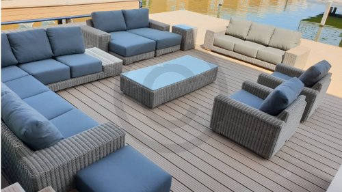 Het aluminium frame is bedekt met 5 mm Pure Hularo draad en voorzien van RVS pootjes. De lounge tafel beschikt over een glasplaat gemaakt van veiligheidsglas. De grijze Olefin kussens hebben een uniek detail, de rugkussen kunnen namelijk op twee manieren gebruikt worden. Voor een wat rustigere look laat u de effen kant van de kussens zien en voor een wat speelser effect ga je voor de kant met de stiknaad. Een kubistische gevormde en toch klassieke tuinset.