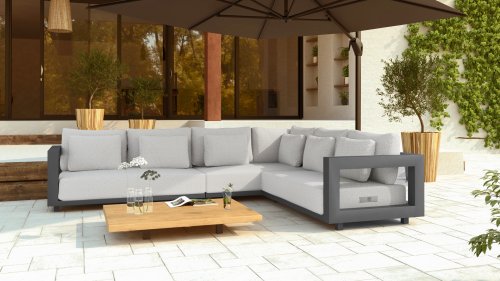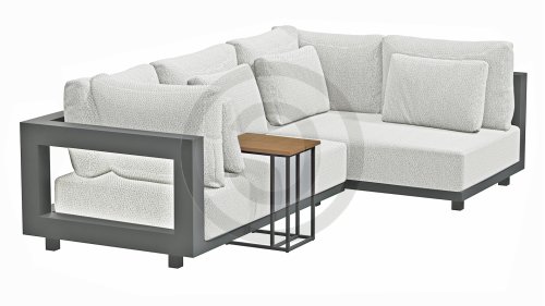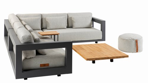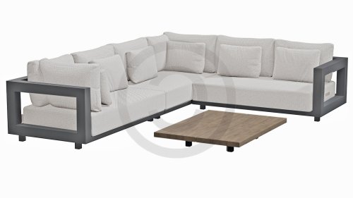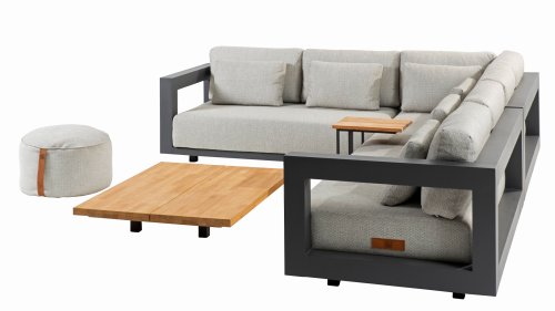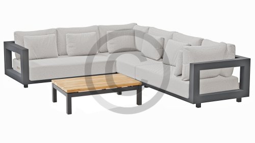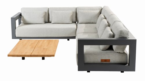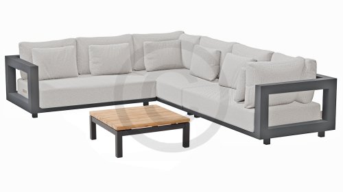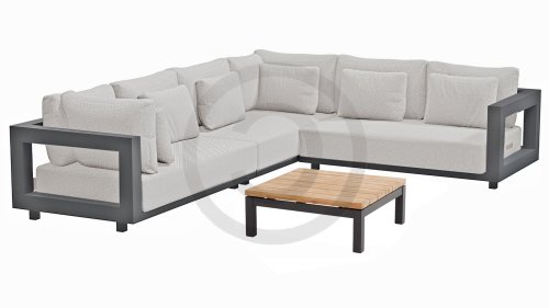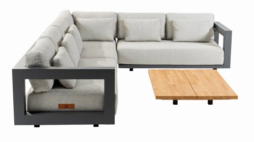 Een groot voordeel van aluminium is het lichte gewicht, waardoor de fauteuilset gemakkelijk te verplaatsen is. Daarnaast roest het niet en heeft het weinig onderhoud nodig. Veeg regelmatig af met een zachte borstel of doek en warm water om het frame schoon te houden. Net als de ounge heeft de salontafel ook een aluminium frame. Het tafelblad van de tafel is gemaakt van FSC teak, een duurzaam en weerbestendig hout. Teakhout heeft een hoge vezeldichtheid, waardoor het hout glad aanvoelt en niet schilfert. Hierdoor is teak een zeer geschikt materiaal voor tuinmeubelen. Omdat het een natuurlijk product is, zal hout na verloop van tijd verouderen en kunnen er barsten en haarscheurtjes ontstaan. Dit is onderdeel van de charme van teakhout en heeft geen effect op de kwaliteit van de lounge. Wil je de originele kleur behouden, dan is het aan te raden om teak te behandelen met een beschermer.