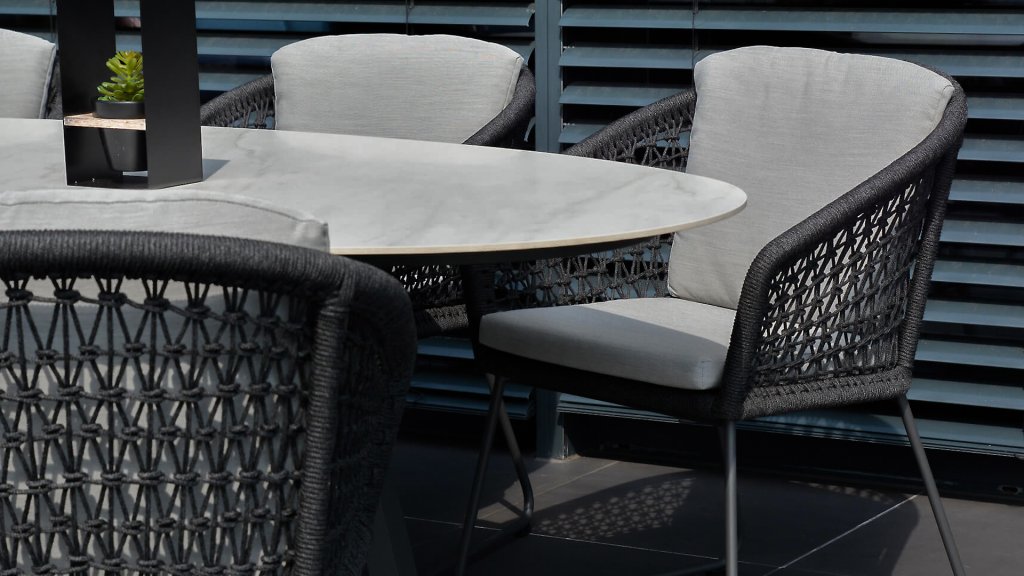 Less is more, binnen onze 4 Seasons Mila serie zijn de tuinmeubelen minimalistisch maar landelijk vormgegeven met vooral functionele eenvoud en sierlijke vormgeving. De prachtige frames zijn gemaakt van Aluminium voor optimale weerbestendigheid. Het onderstel is fragiel gevormd maar oersterk, in antraciet kleur gepoedercoat R.V.S.. Het R.V.S. onderstel heeft de z.g.n. "slee-poot" vorm welke gecombineerd met het prachtige antraciet kleurige vlechtwerk een modern maar toch "warme" uitstraling geeft. De ronde vormen houden dit design helemaal in balans.