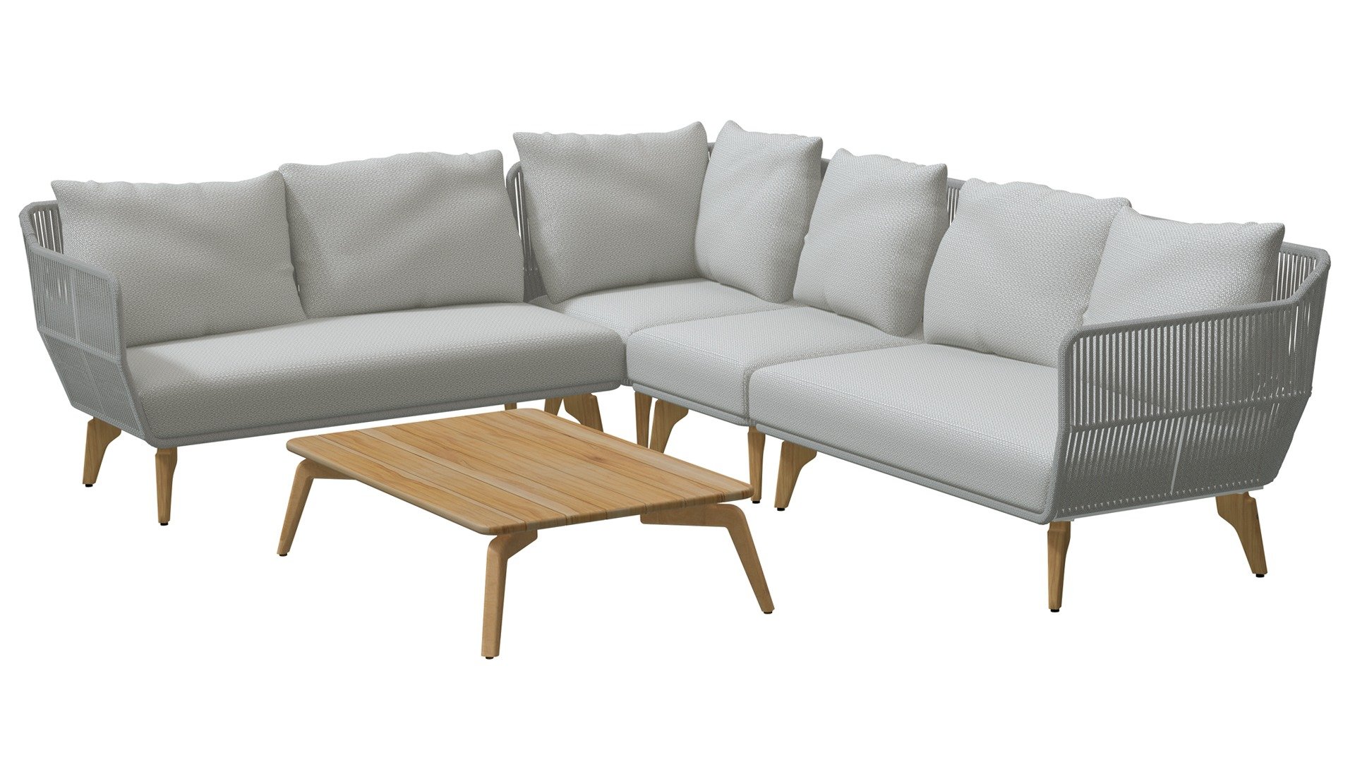 Hoekbank Raphael van 4 Seasons Outdoor maakt gebruik van zachte, harmonieuze tinten en een aangenaam rond design. Super dikke, comfortabele kussens en warme teakhouten onderstel versterken het vertrouwde en warme imago van de bank. De 4 Seasons Outdoor Raphael Lounge (Frozen) is een prachtige loungeset met lichtgrijze kussens en teakhouten poten. Modulair, dus geschikt voor het opmeten van elke tuin.