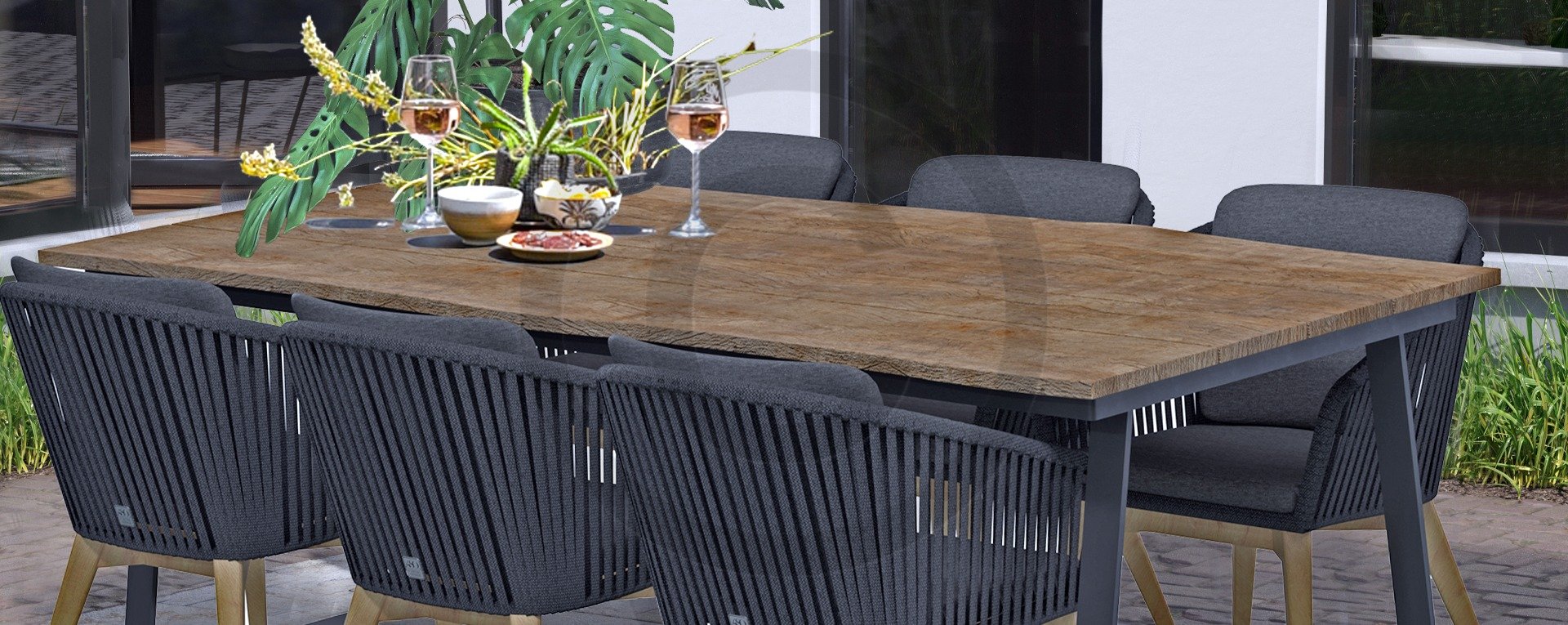 De 4 Seasons Santander Dining is leverbaar in 2 kleuren: Mid Grey met Instant Grey Teak en Black met Natural Teak.