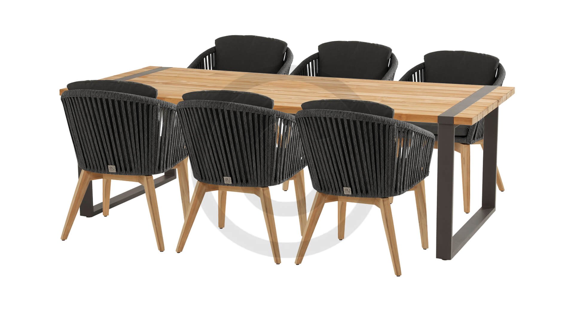 De 4Seasons Santander, modern met een landelijke uitstraling. Verkrijgbaar in Antraciet en Mid grey. De Santander wordt geleverd met teakhouten poten wat er voor zorgt dat het goed te combineren valt met teak tafels. Het draad is kunststof draad dat strak is omgevlochten door de vakmensen van 4SO. Het bevat een kern wat het stevig maakt én kleurvast. Dineer in de Santander serie.