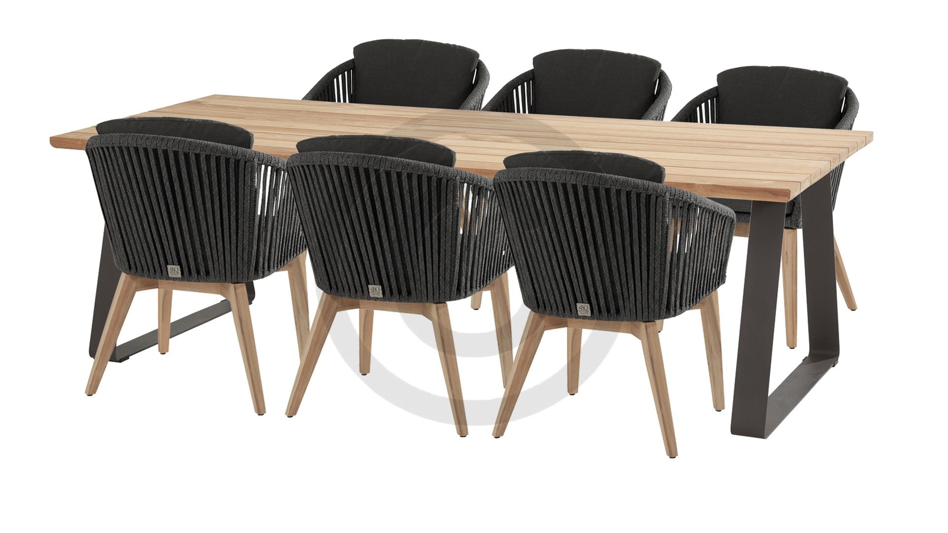 De 4Seasons Santander, modern met een landelijke uitstraling. Verkrijgbaar in Antraciet en Mid grey. De Santander wordt geleverd met teakhouten poten wat er voor zorgt dat het goed te combineren valt met teak tafels. Het draad is kunststof draad dat strak is omgevlochten door de vakmensen van 4SO. Het bevat een kern wat het stevig maakt én kleurvast. Dineer in de Santander serie.