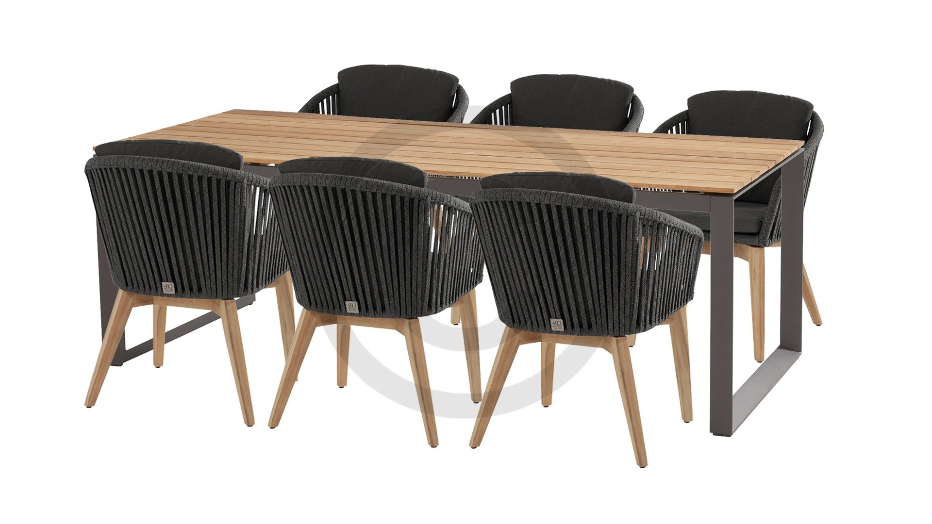 De 4Seasons Santander, modern met een landelijke uitstraling. Verkrijgbaar in Antraciet en Mid grey. De Santander wordt geleverd met teakhouten poten wat er voor zorgt dat het goed te combineren valt met teak tafels. Het draad is kunststof draad dat strak is omgevlochten door de vakmensen van 4SO. Het bevat een kern wat het stevig maakt én kleurvast. Dineer in de Santander serie.