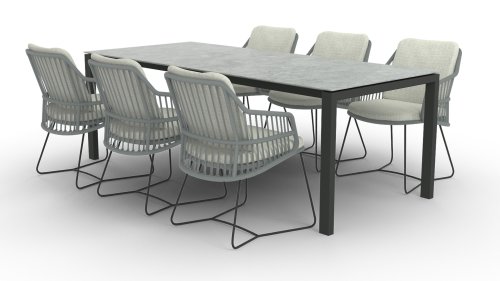 Less is more, binnen onze 4Seasons Sempre serie zijn de tuinmeubelen minimalistisch maar landelijk vormgegeven met vooral functionele eenvoud en sierlijke vormgeving. De prachtige frames zijn gemaakt van Aluminium voor optimale weerbestendigheid. Het onderstel is fragiel gevormd maar oersterk, in antraciet kleur gepoedercoat R.V.S.. Het R.V.S. onderstel heeft de z.g.n. "slee-poot" vorm welke gecombineerd met het prachtige silver grey kleurige vlechtwerk een modern maar toch "warme" uitstraling geeft. De ronde vormen houden dit design helemaal in balans.