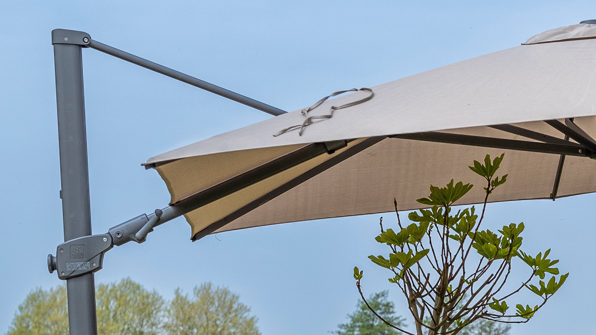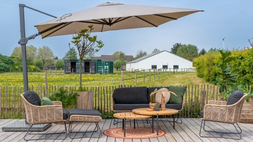 Iedere hangarmparasol van 4Seasons Outdoor kan draaien op de sokkel en naar achteren kantelen om de lage zon op te vangen.