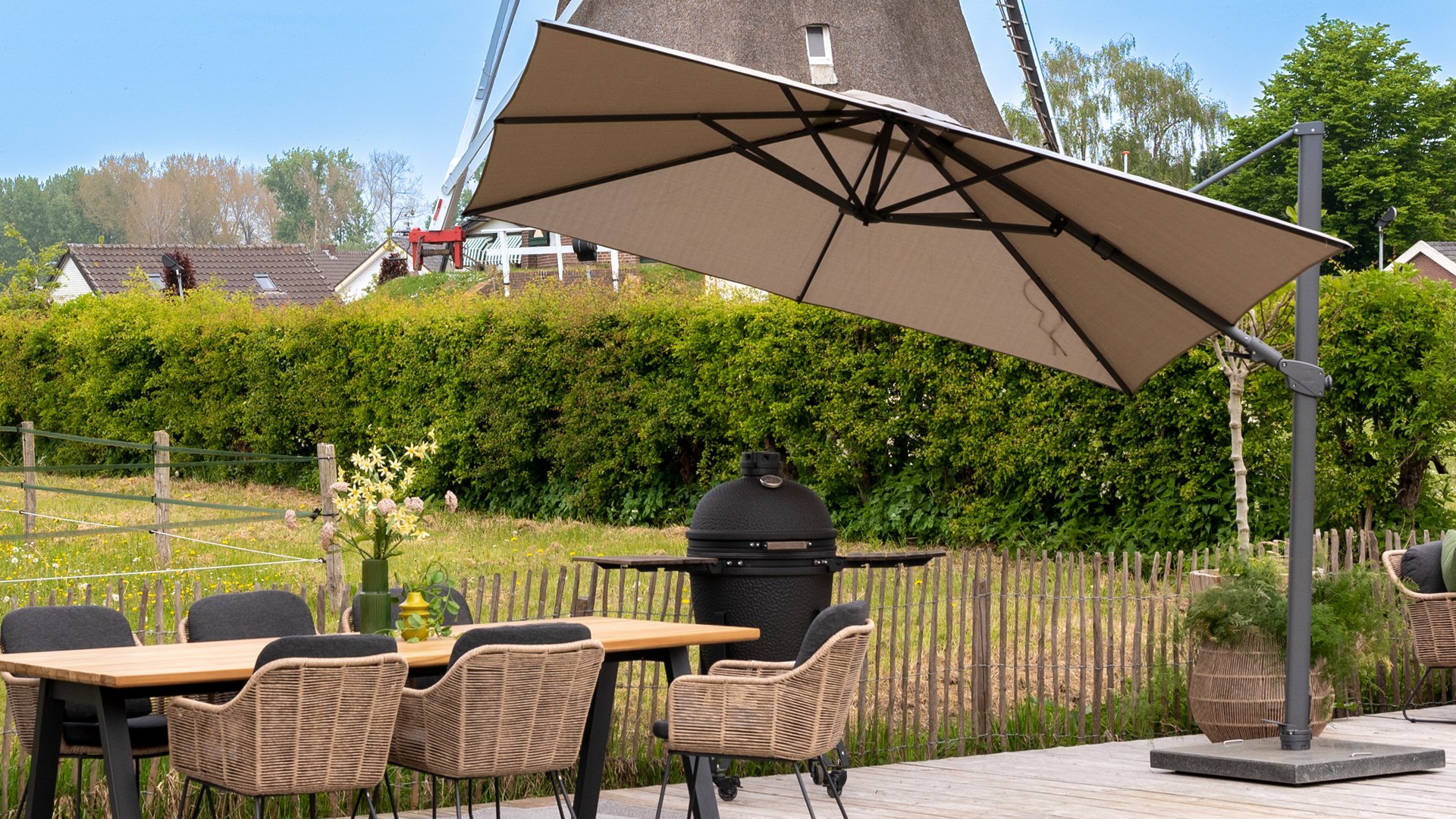 Neemt u wielen erbij, dan is de parasol ook verplaatsbaar op uw terras.