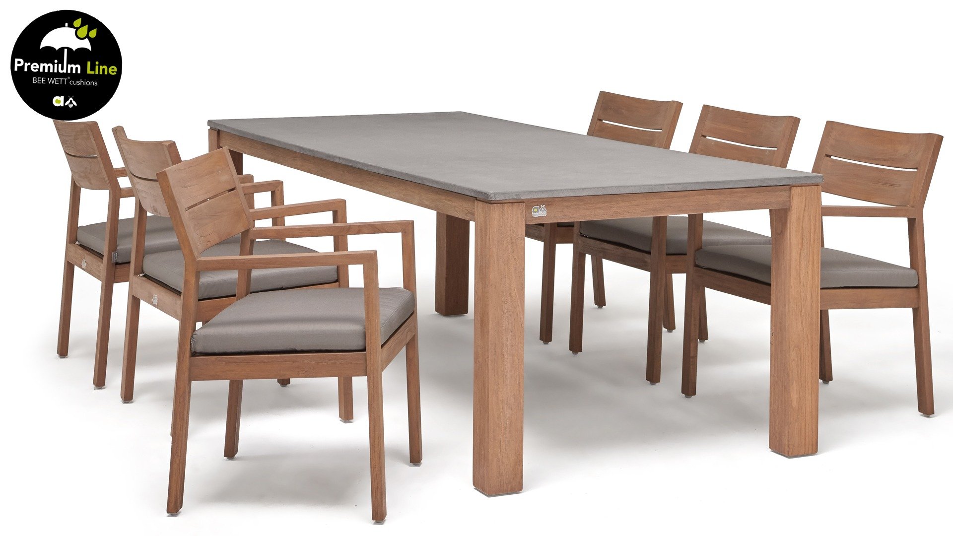Applebee Berkeley 240 bestaat uit een LWC tafelblad met teakhouten poten. Light Weight Concrete is onderhoudsvrij.