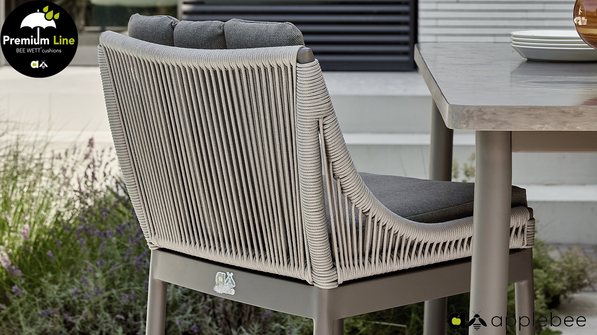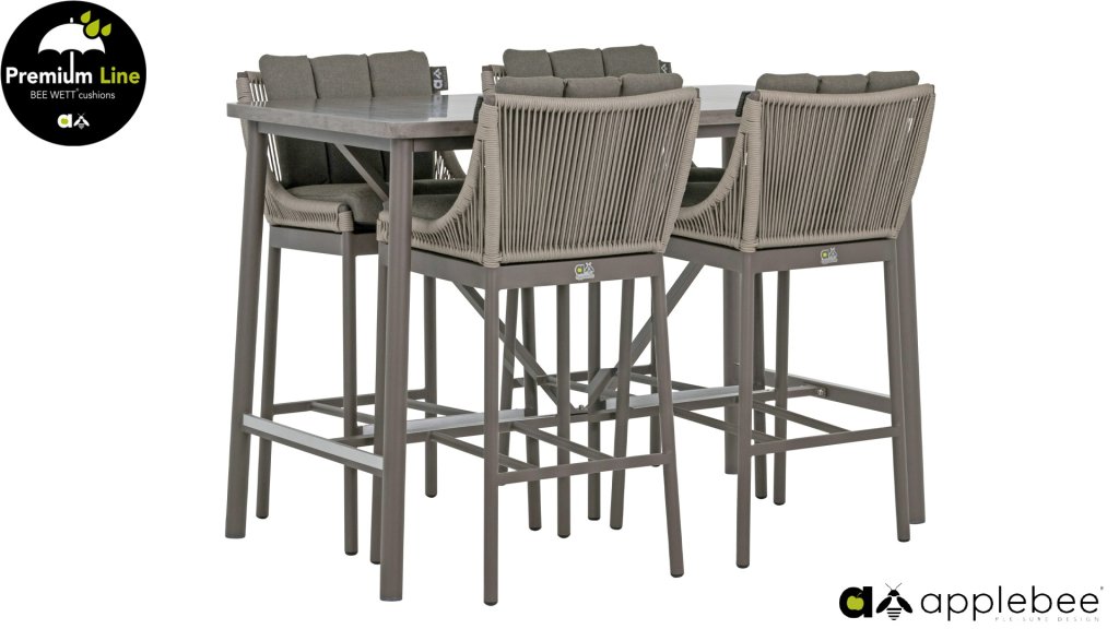 De Bijou barset is van het merk AppleBee. De tuinstoel heeft een moderne uitstraling doordat er gebruik is gemaakt is van Ash Grey rope. De AppleBee Bijou barstoel heeft een sterk frame dat gepoedercoat is in de kleur Taupe. Het frame is met rope afgewerkt in de kleur Ash Grey. Het rope is van all weather materiaal gemaakt en kan dus het gehele jaar buiten blijven staan.