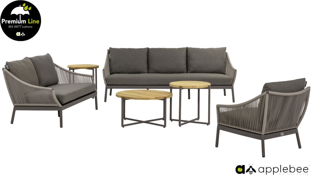 De gestroomlijnde Bijou Lounge van Applebee kenmerkt zich door het tweelaags gevlochten rope, waar je doorheen kunt kijken. Om het aluminium frame is rope-draad gevlochten die de hoeken openlaat, waar de taupe kleur zichtbaar wordt. De fijne, gebogen contouren van dit meubel zorgt voor een strak maar toch elegant aanzicht. In combinatie het harmonieuze samenspel van de taupe kleuren en het vlechtwerk is de luxueuze Bijou een prachtige toevoeging in de tuin. Uiteraard is deze lounge set ook weer uitgerust met onze Bee Wett® kussens.