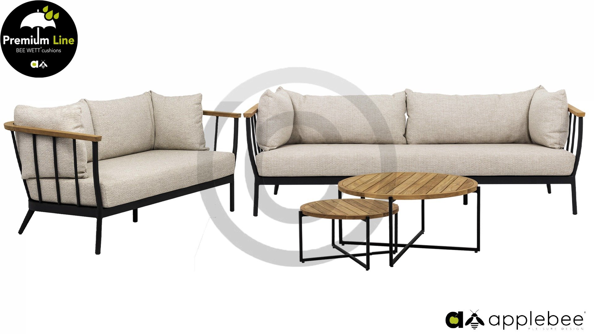 De Applebee Condor lounge heeft een strakke, stoere look. Het basismateriaal is matzwart gepoedercoat aluminium. De BEE WETT® kussens hebben een grove weefstructuur, maar met een soft touch. De mooie rondingen in de rug en het gebruik van naturel teakhout in de leuningen geven de Condor een aangenaam vleugje natuurlijke warmte mee