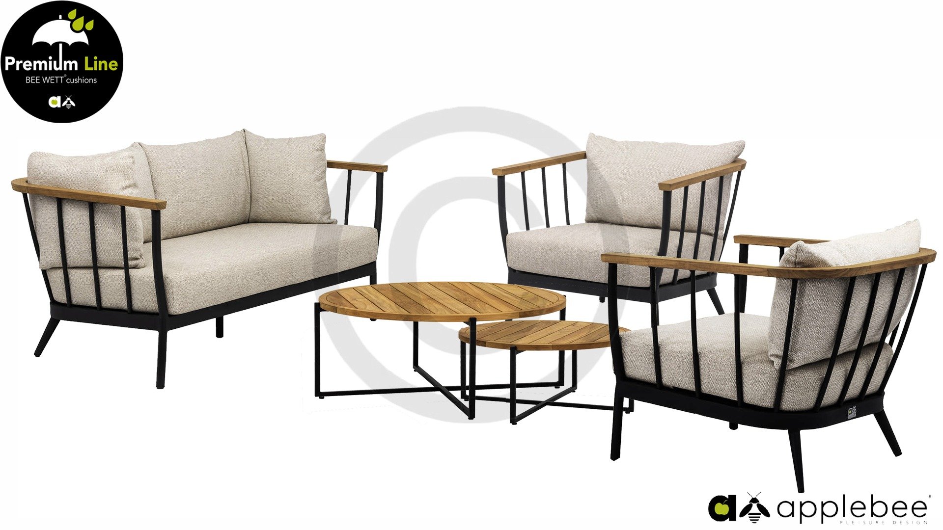 De Applebee Condor lounge heeft een strakke, stoere look. Het basismateriaal is matzwart gepoedercoat aluminium. De BEE WETT® kussens hebben een grove weefstructuur, maar met een soft touch. De mooie rondingen in de rug en het gebruik van naturel teakhout in de leuningen geven de Condor een aangenaam vleugje natuurlijke warmte mee.