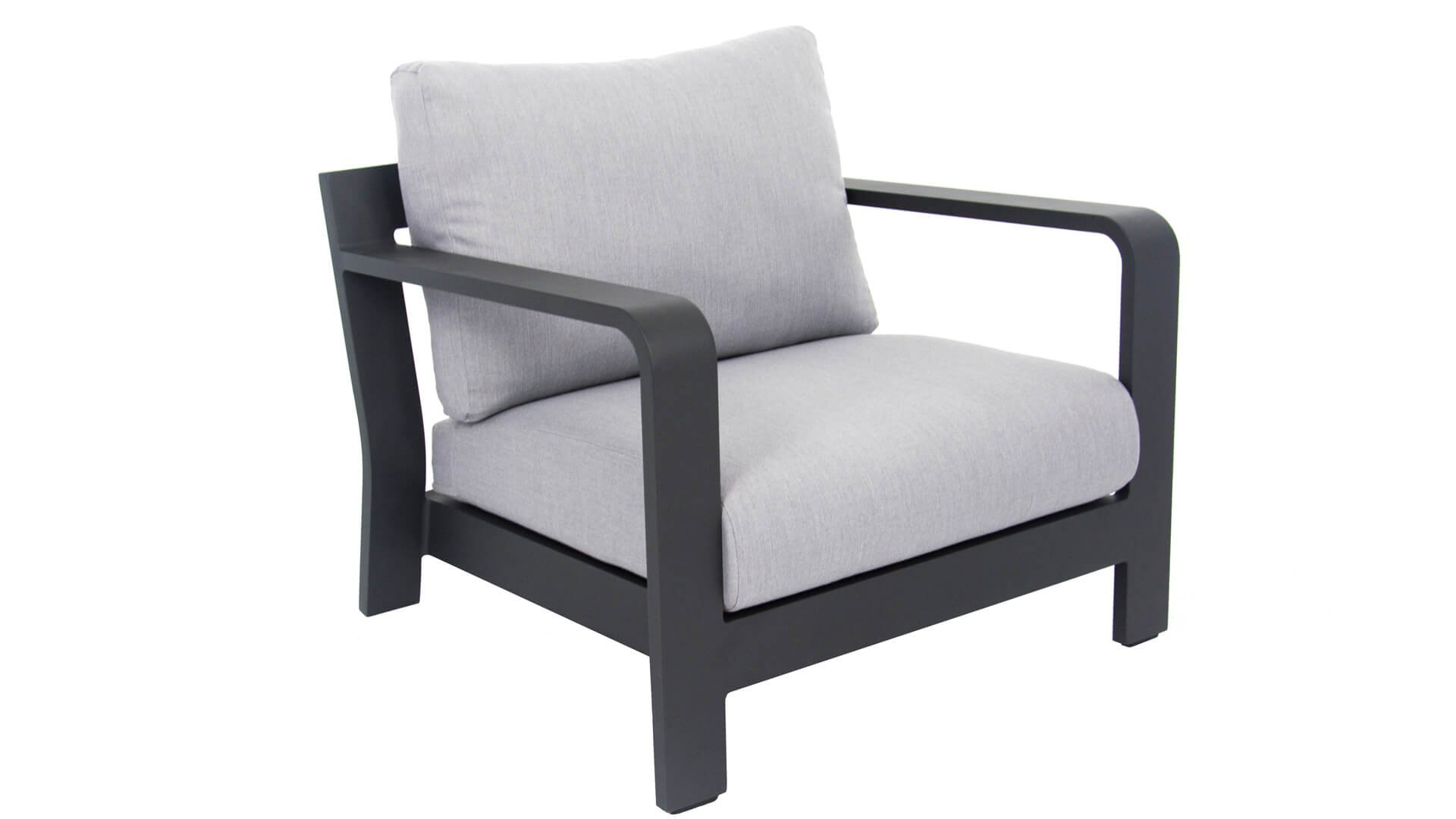 Stoer en krachtig, maar toch subtiel. Het indrukwekkende eigen karakter van de Applebee Delgado loungeset wordt getypeerd door de gebogen lijnen in de rug van de loungestoel en sofa. Het frame is gemaakt van aluminium en afgewerkt in de matte kleur antraciet. De combinatie met de lichtgrijze kussens en de zilverkleurige aluminium buisjes in de rug van het meubel, geeft de Delgado een luxe uitstraling