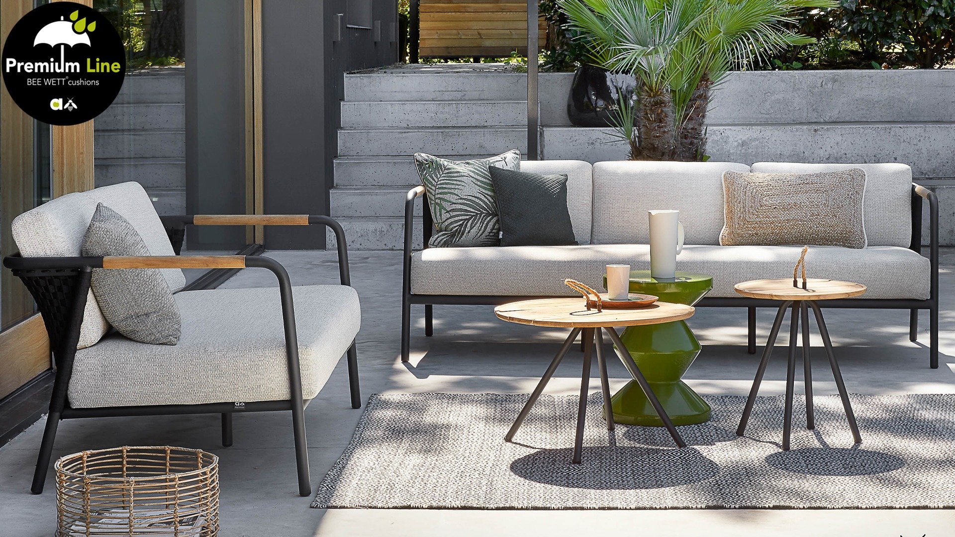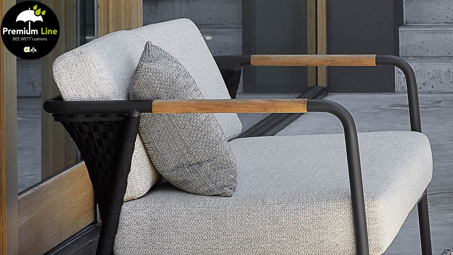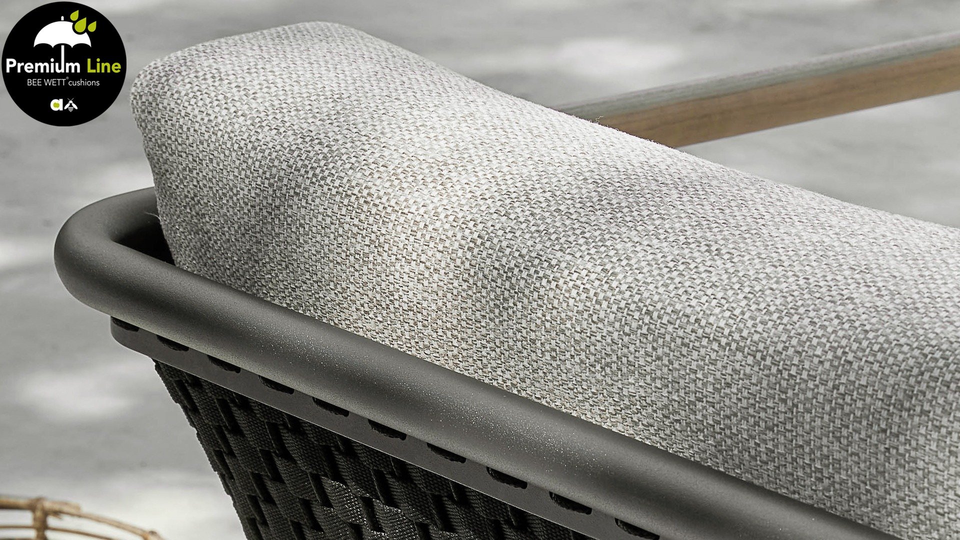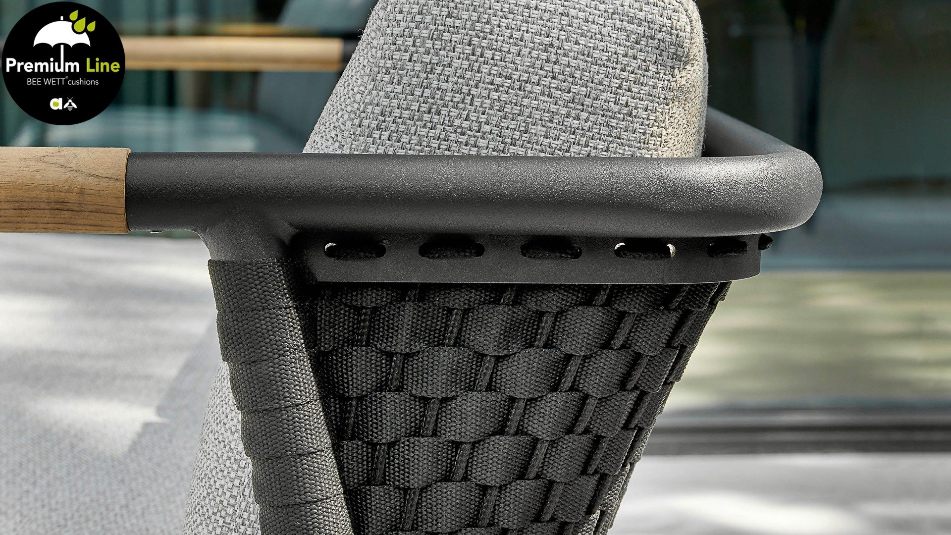 Het basismateriaal van de Elle set is matzwart gepoedercoat aluminium. De BEE WETT® kussens hebben een grove weefstructuur, maar dit wel met een soft touch voor het optimale comfort. Samen met de mooie rondingen in de rug en het gebruik van naturel teakhout in het tafelblad en de stoelleuningen, krijgt de Applebee Elle Lounge toch dat aangename vleugje natuurlijke warmte mee. De rugleuning is voorzien van een solide gevlochten zwartkleurige belt, die als het ware het rug kussen op de hoeken omarmt.