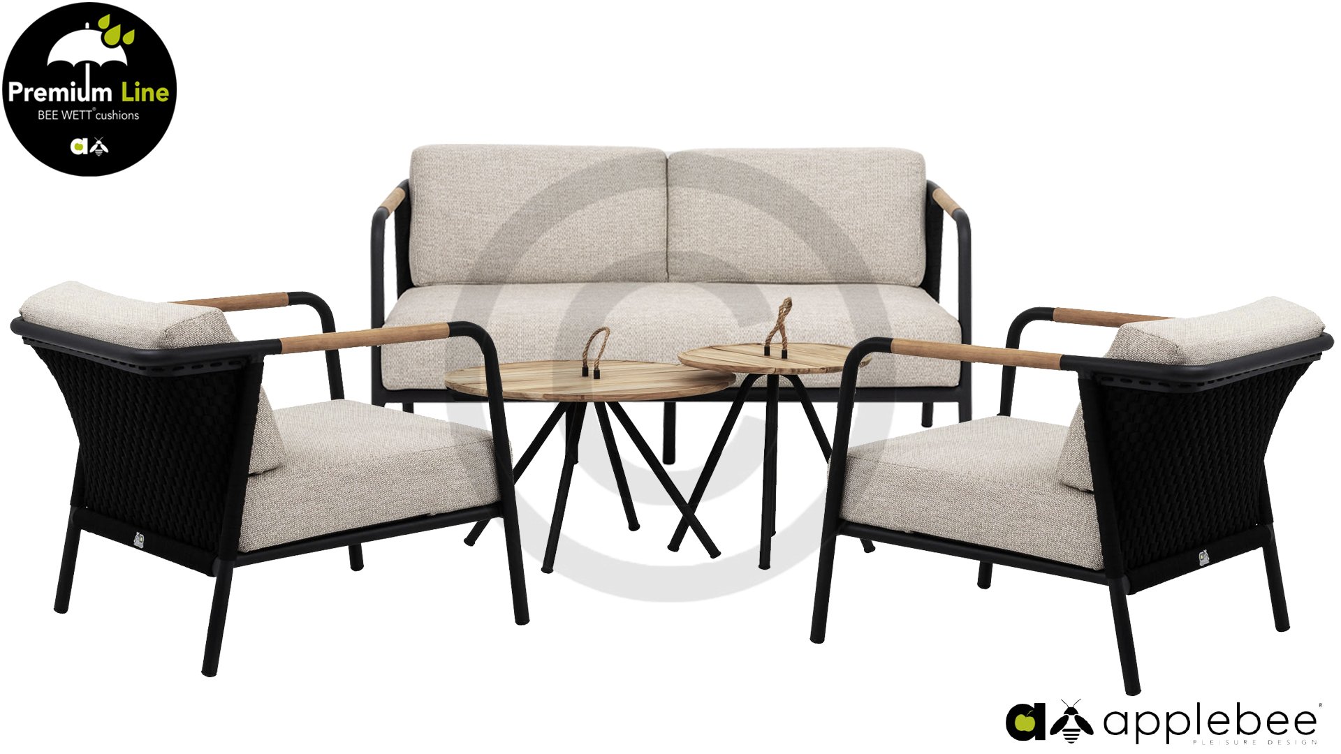 Door de slimme belijning oogt deze Applebee Elle Belt lounge set slank, terwijl ze toch een zee aan zitruimte biedt. Het ronde matzwart aluminium buisframe wordt afgewisseld met een naturel teakhouten armlegger. De rugleuning is voorzien van een solide gevlochten zwartkleurige belt, die als het ware het rug kussen op de hoeken omarmt.