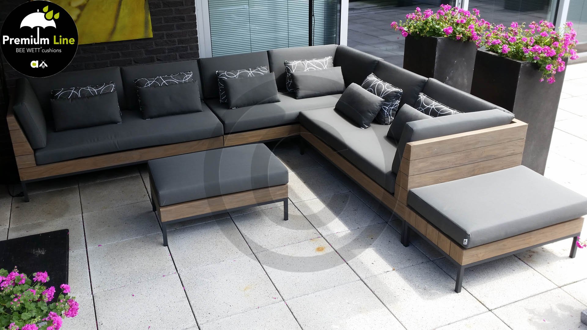 Het slanke aluminium frame aan de onderkant van de loungeset zorgen voor contrast met de robuuste bovenkant. De donkergrijze Bee Wett kussens maken het geheel af.