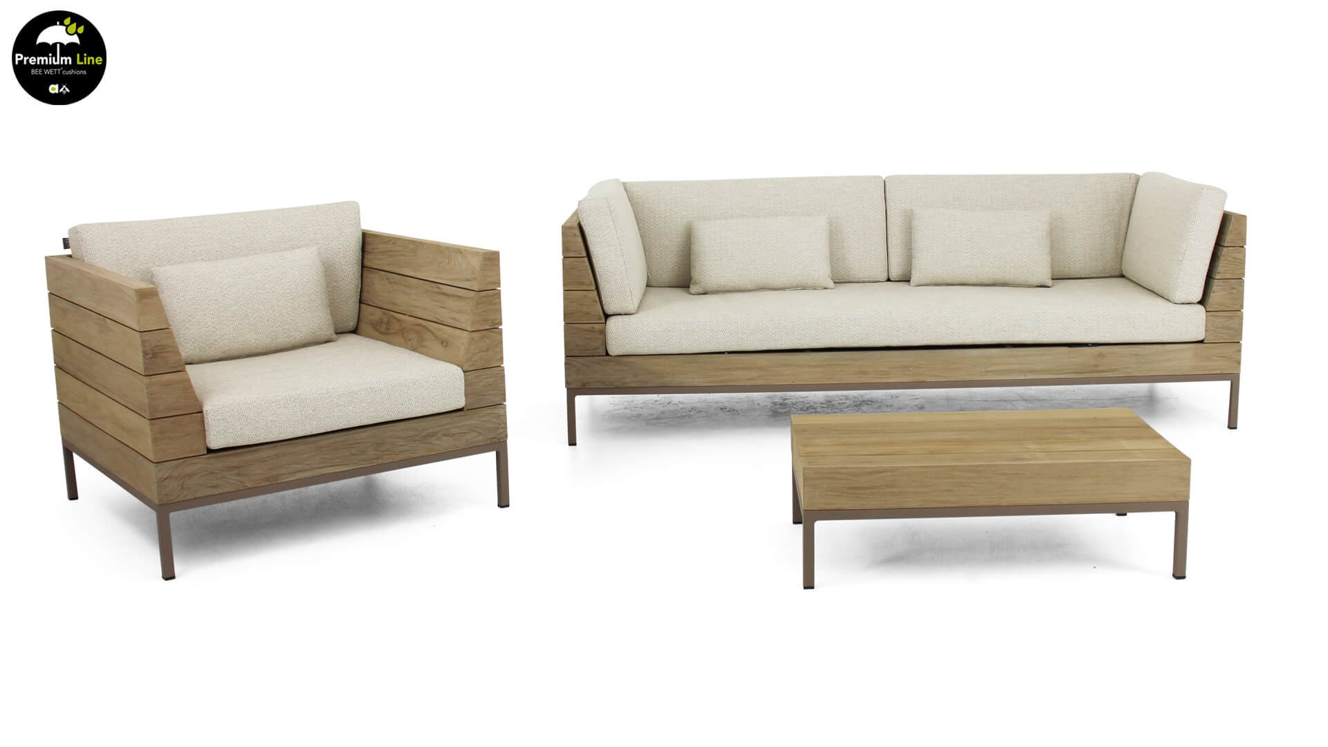 De Applebee Long Island lounge set is modulair en geschikt om grote en kleine opstellingen mee te maken. Het teakhout is bewerkt met een Coastal kleur finish. De strakke lijnen zijn kenmerkend voor het uiterlijk van deze mooie set. De grof geweven stof geeft de set een luxe uitstraling en brengt een beachy sfeer in jouw tuin!