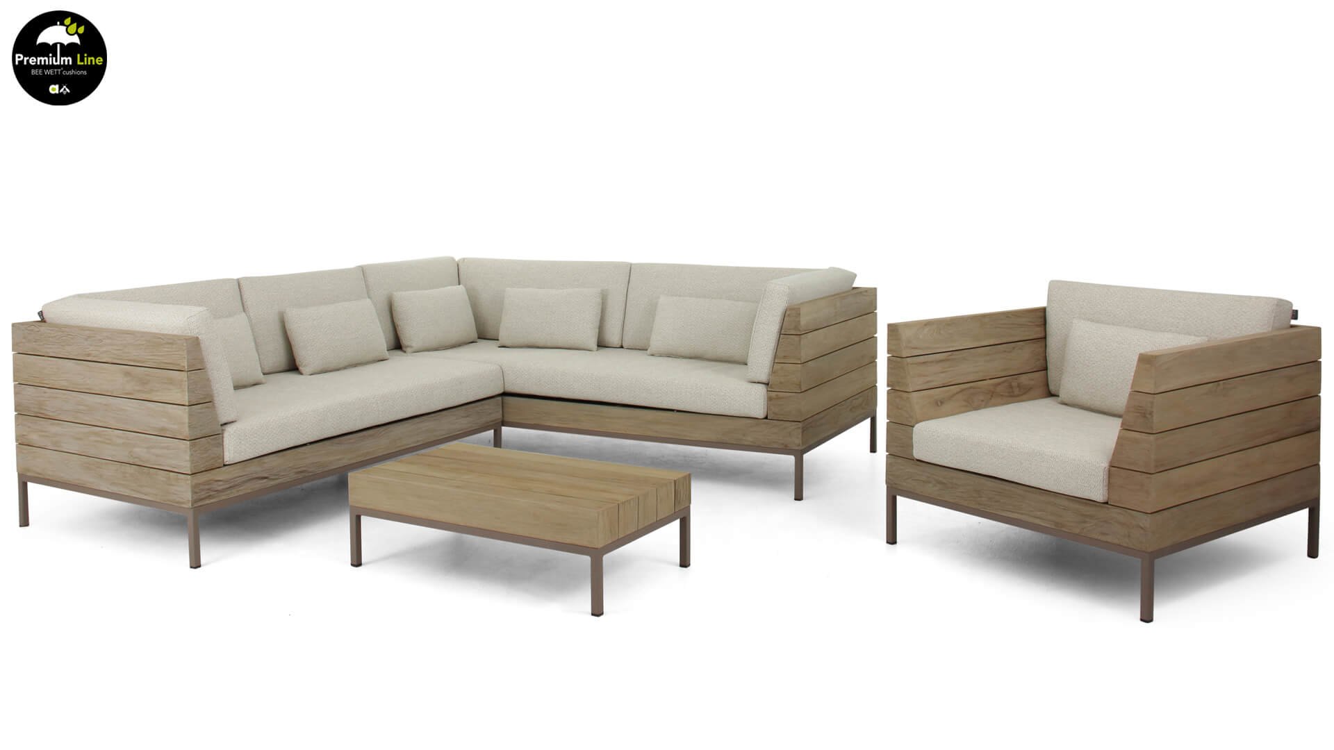 De Applebee Long Island lounge set is modulair en geschikt om grote en kleine opstellingen mee te maken. Het teakhout is bewerkt met een Coastal kleur finish. De strakke lijnen zijn kenmerkend voor het uiterlijk van deze mooie set. De grof geweven stof geeft de set een luxe uitstraling en brengt een beachy sfeer in jouw tuin!