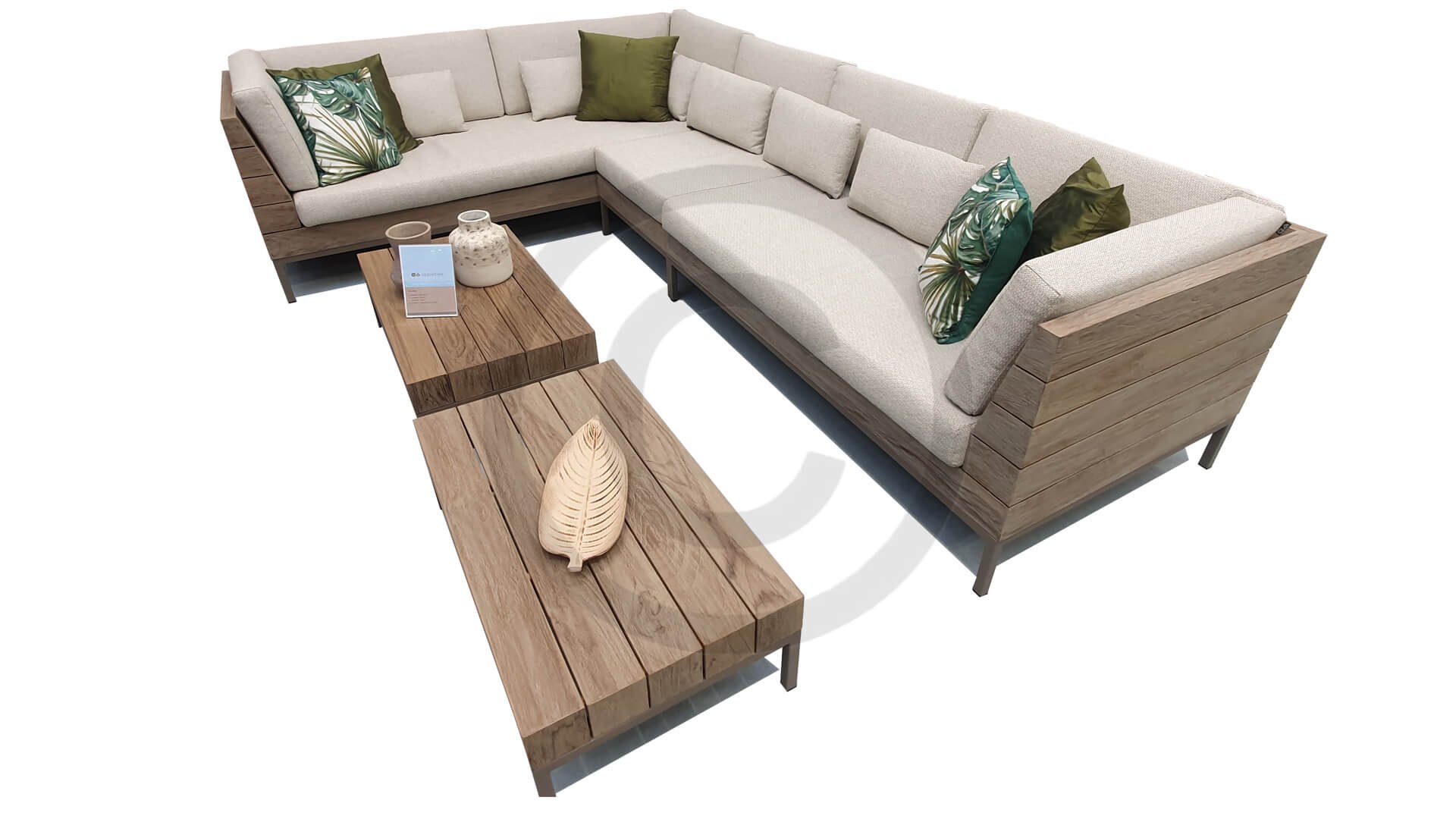 De Long Island lounge set is modulair en geschikt om grote en kleine opstellingen mee te maken. Het teakhout is bewerkt met een Coastal kleur finish. De strakke lijnen zijn kenmerkend voor het uiterlijk van deze mooie set. De grof geweven stof geeft de set een luxe uitstraling en brengt een beachy sfeer in jouw tuin!