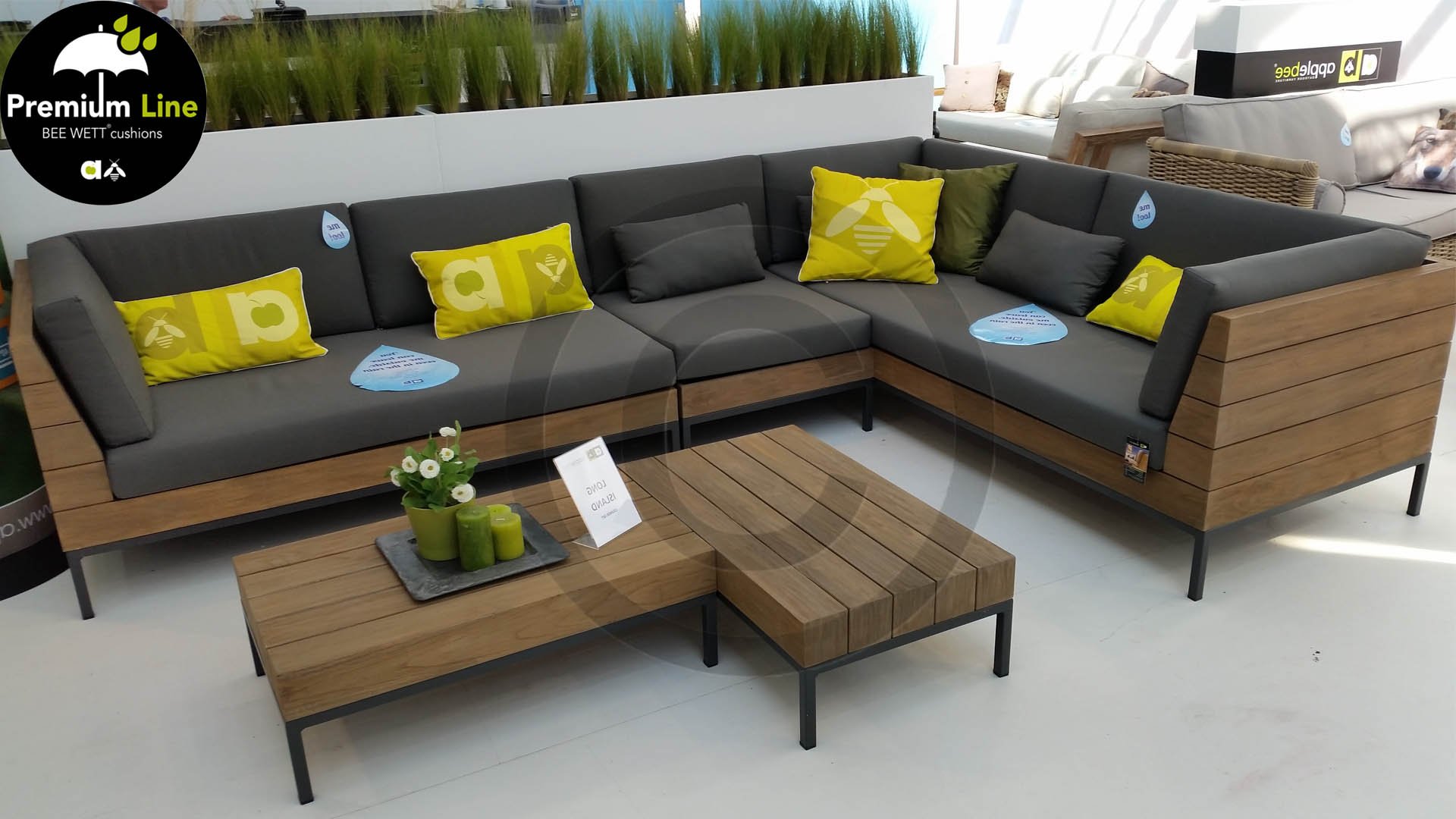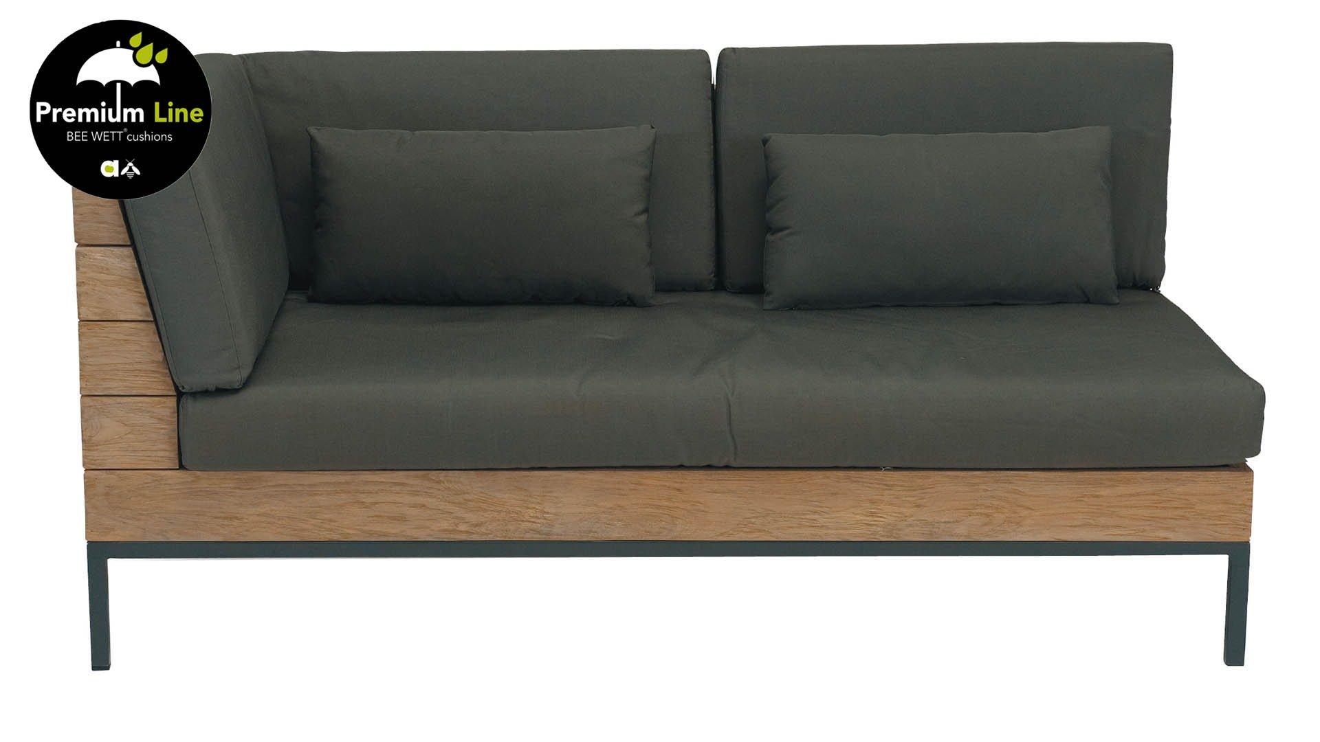 Het slanke aluminium frame aan de onderkant van de loungeset zorgen voor contrast met de robuuste bovenkant. De donkergrijze Bee Wett kussens maken het geheel af.