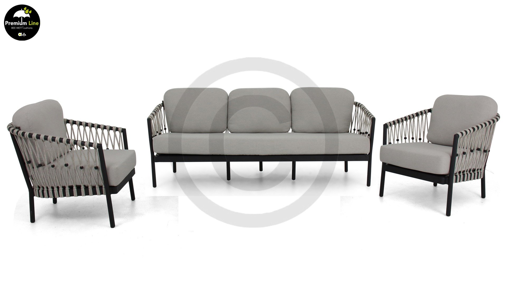 De Menton lounge set van Applebee is op een bijzondere manier ingevlochten. Het gemêleerde draad (Rope) is oersterk. Waar de draden elkaar kruisen, bevindt zich een fraaie zwarte `parel`.