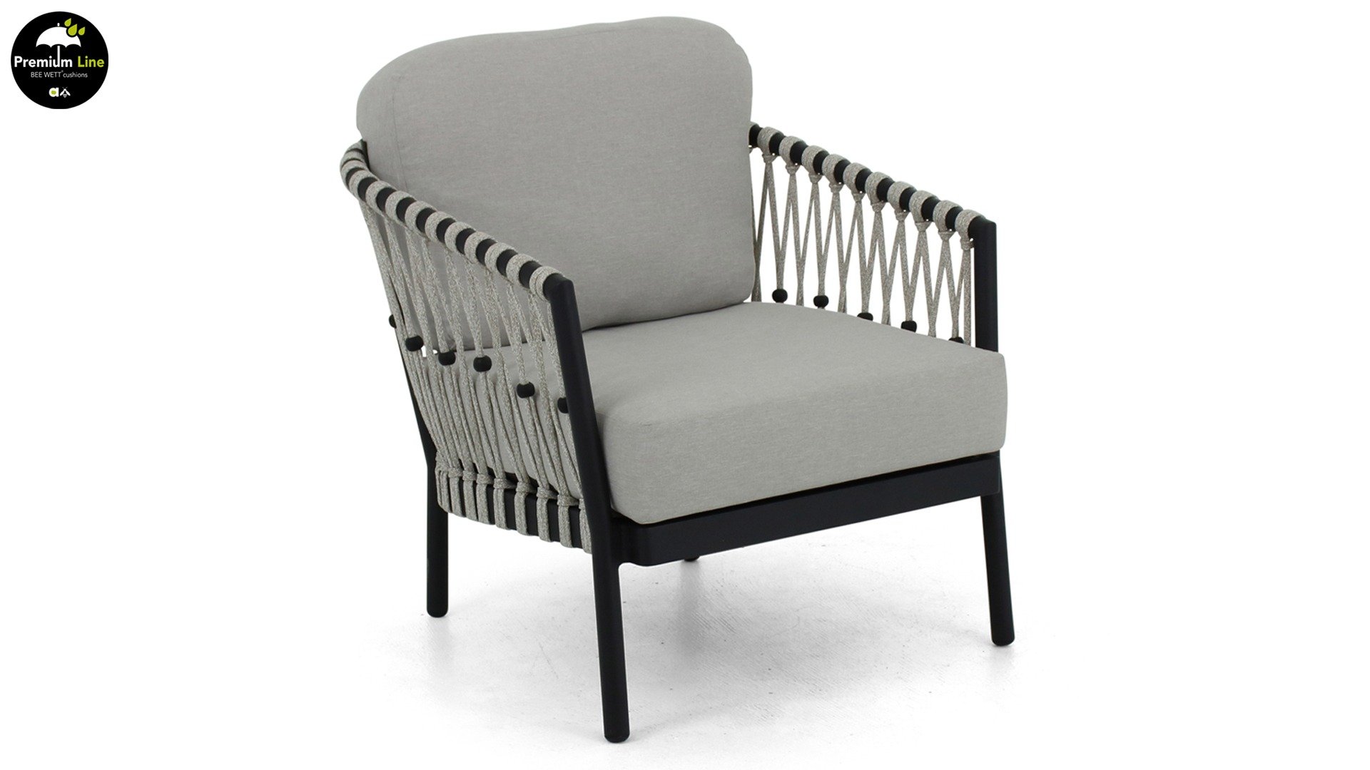 De Menton lounge set van Applebee is op een bijzondere manier ingevlochten. Het gemêleerde draad is oersterk. Waar de draden elkaar kruisen, bevindt zich een fraaie zwarte `parel`. Het vlechtpatroon zie je terug in het onderstel van de Menton koffietafels.