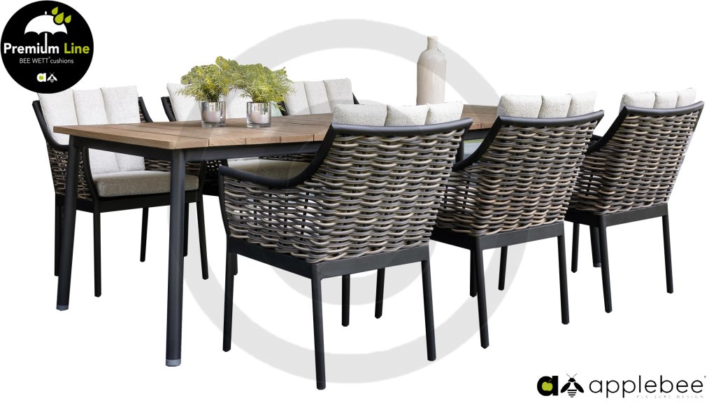 De AppleBee Milou tuinstoel, natuurgetrouw om te zien, maar in de bekende stevige Biculair® buitenkwaliteit die u van Apple Bee gewend bent. Dit vlechtwerk wordt omlijst door een zwart gepoedercoat frame met gebogen lijnen, waaraan tuinset Milou haar chique, moderne look ontleent. Bij de premium line zijn de kussens voorzien van Bee Wett® technologie, wat ervoor zorgt dat de kussens weer snel droog zijn na een fikse regenbui. U kunt de kussens dus gewoon buiten laten liggen. De drainage aan de onderzijde van het kussen zorgt er namelijk voor dat het water de kussens eenvoudig kan verlaten.