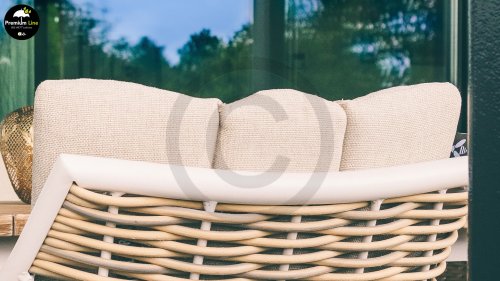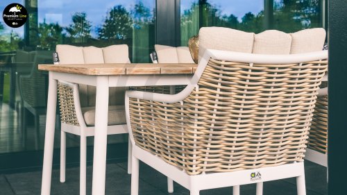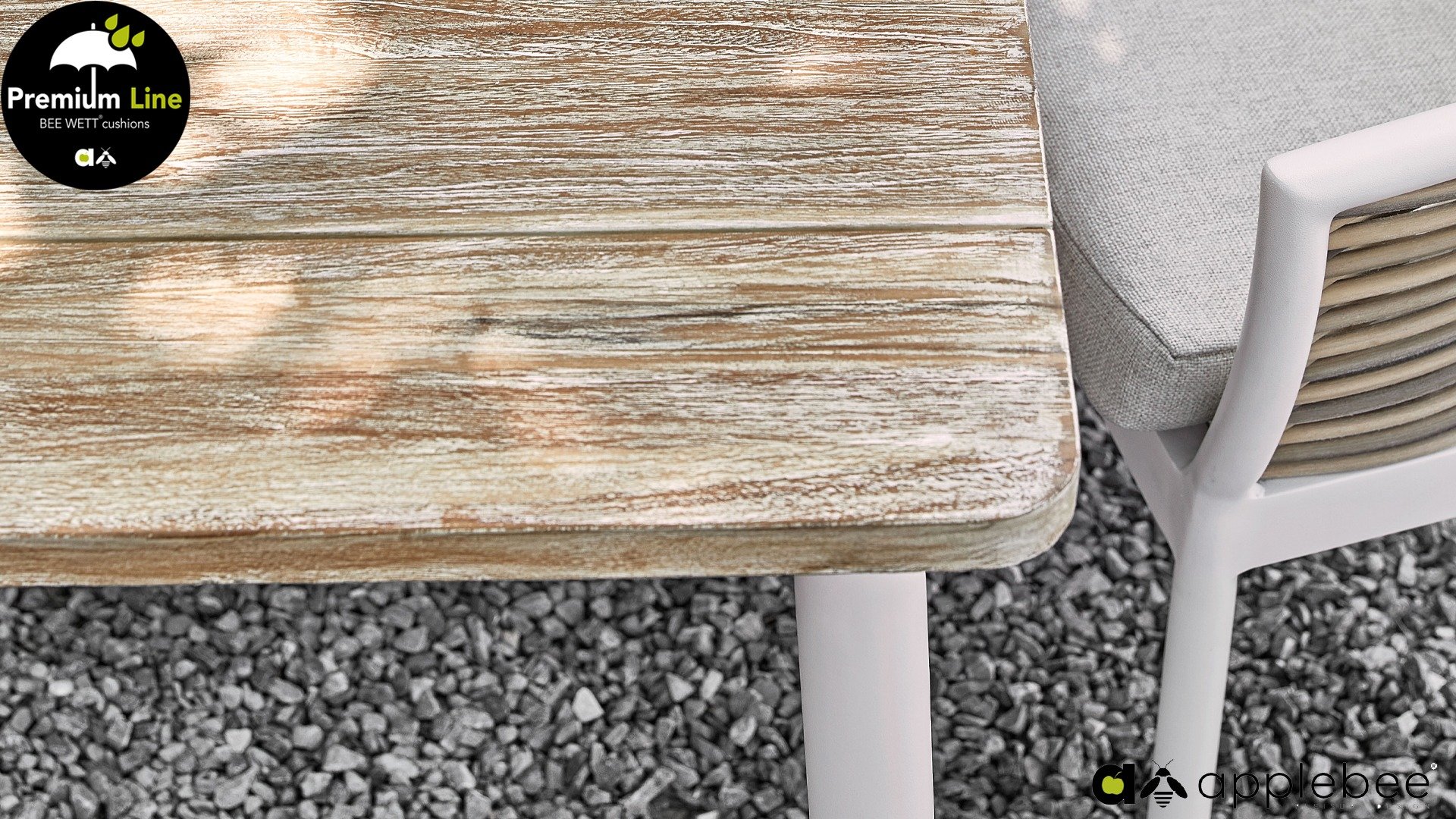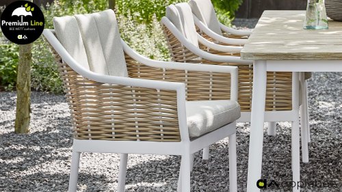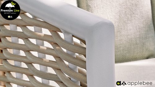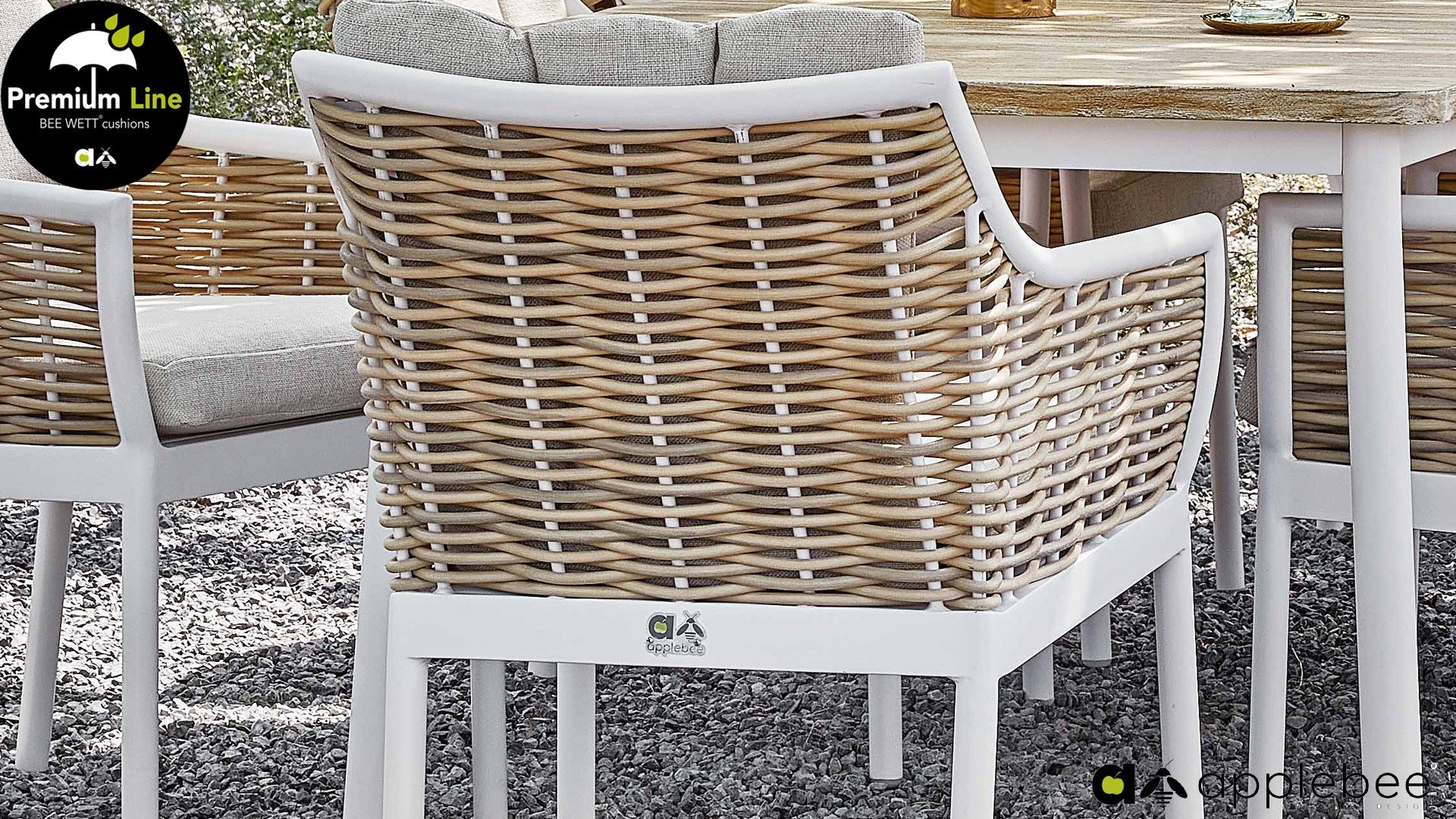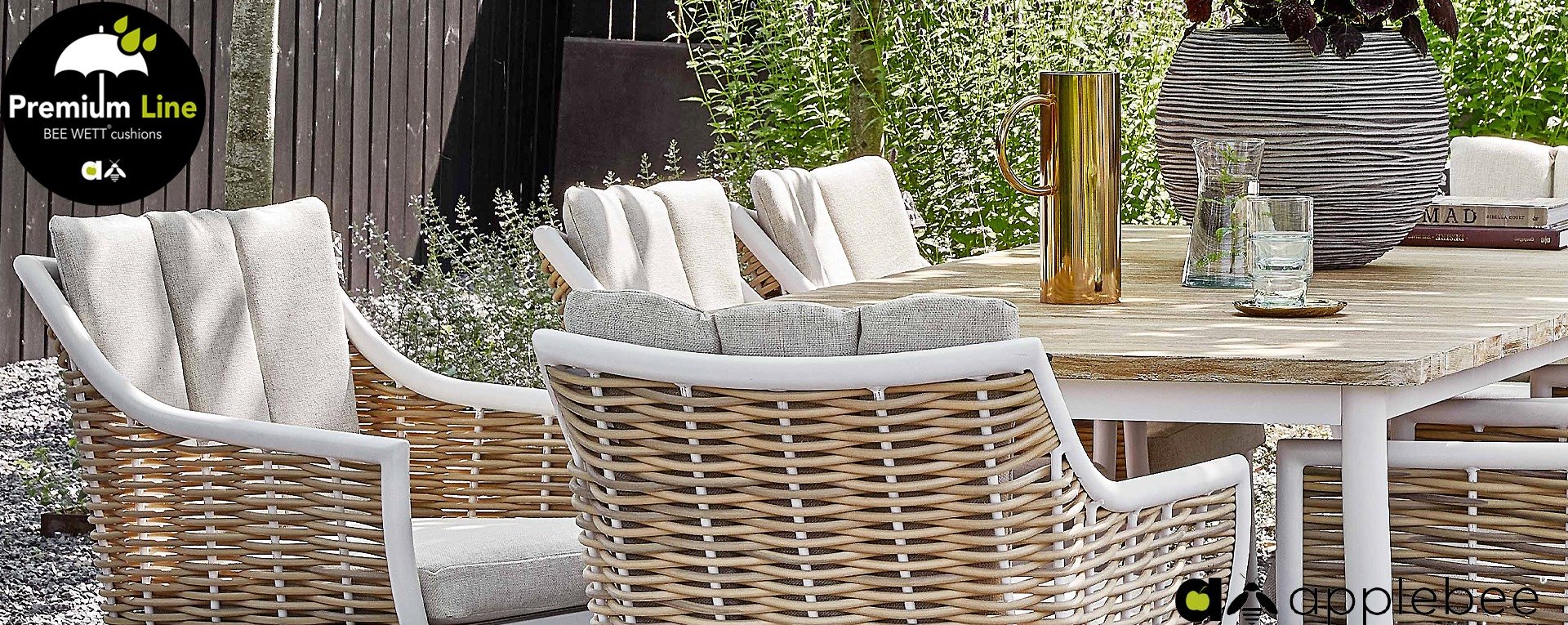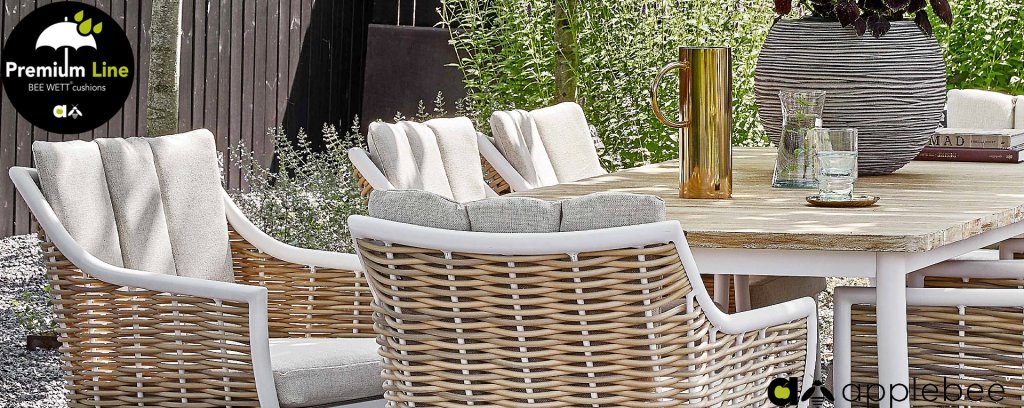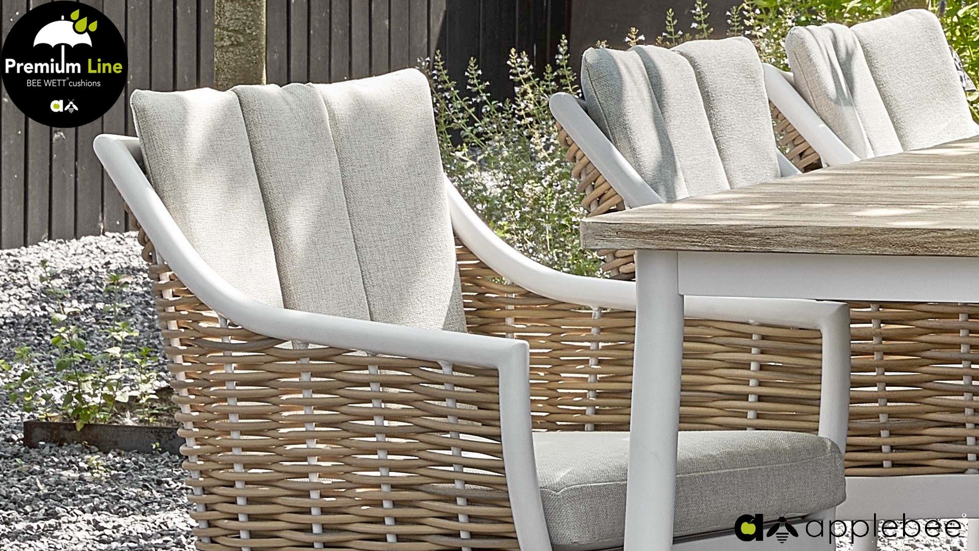 Bij de premium line zijn de kussens voorzien van Bee Wett® technologie, wat ervoor zorgt dat de kussens weer snel droog zijn na een fikse regenbui. U kunt de kussens dus gewoon buiten laten liggen. De drainage aan de onderzijde van het kussen zorgt er namelijk voor dat het water de kussens eenvoudig kan verlaten. Het extreem dikke vlechtdraad vergt een bijzondere vlechttechniek, die alleen de beste vlechters beheersen. Deze ambachtslieden vlechten iedere draad één voor één handmatig in. U haalt met AppleBee Milou tuinset dus een echt staaltje ambachtskunst in huis. Prachtige combinatie met een teakhouten tafel!