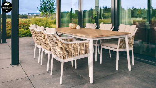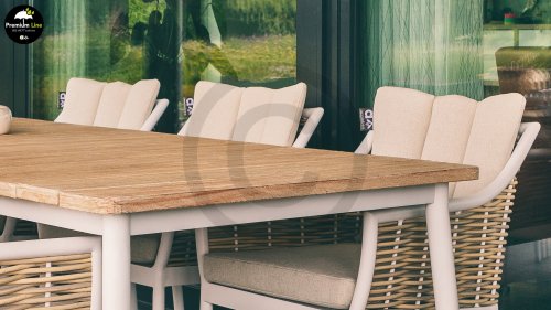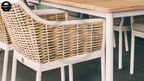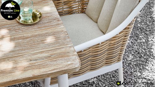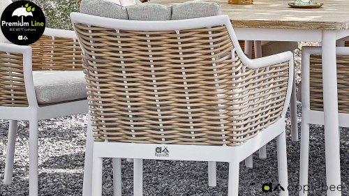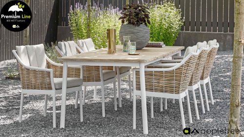 Het uitgesproken succes van de Applebee Milou tuinset Black zorgde voor een grote vraag vanuit de markt naar een bijpassende White dining combinatie. Ontwerper Sako is hiermee aan de slag gegaan en zo ontstond de Applebee Milou White Dining set. De Milou collectie is herkenbaar aan het vlechtwerk, wat bijna gemaakt lijkt van wilgentakken. De eettafel van deze set is verkrijgbaar met een SVLK teak blad. Zo is er altijd wel een Milou serie die bij jouw terras past! De kussens in deze tuinset zijn gemaakt met de BEE WETT® technologie en worden gedragen door een White aluminium frame. Ook leverbaar in de Black kleur!