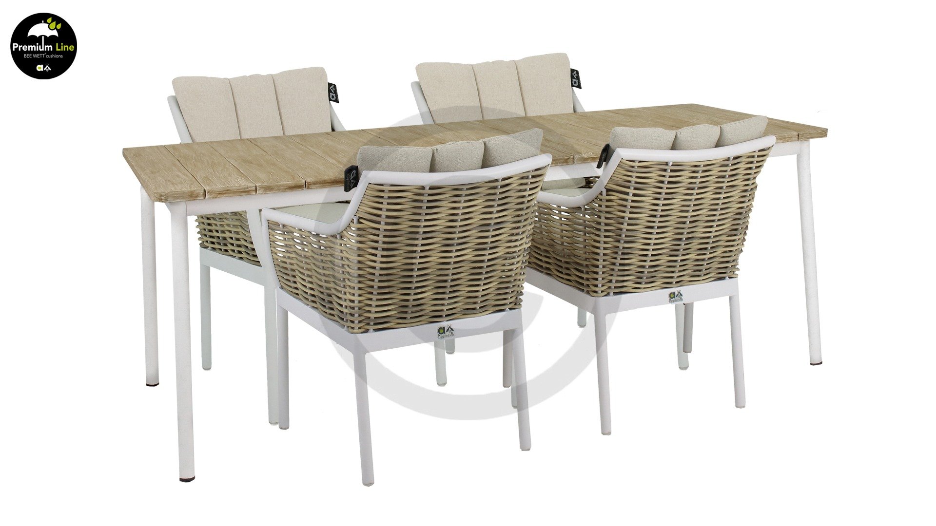 Het uitgesproken succes van de Applebee Milou tuinset Black zorgde voor een grote vraag vanuit de markt naar een bijpassende White dining combinatie. Ontwerper Sako is hiermee aan de slag gegaan en zo ontstond de Applebee Milou White Dining set. De Milou collectie is herkenbaar aan het vlechtwerk, wat bijna gemaakt lijkt van wilgentakken. Bij de premium line zijn de kussens voorzien van Bee Wett® technologie, wat ervoor zorgt dat de kussens weer snel droog zijn na een fikse regenbui. U kunt de kussens dus gewoon buiten laten liggen. De drainage aan de onderzijde van het kussen zorgt er namelijk voor dat het water de kussens eenvoudig kan verlaten. Het extreem dikke vlechtdraad vergt een bijzondere vlechttechniek, die alleen de beste vlechters beheersen. Deze ambachtslieden vlechten iedere draad één voor één handmatig in. U haalt met AppleBee Milou tuinset dus een echt staaltje ambachtskunst in huis. Prachtige combinatie met een teakhouten tafel!
