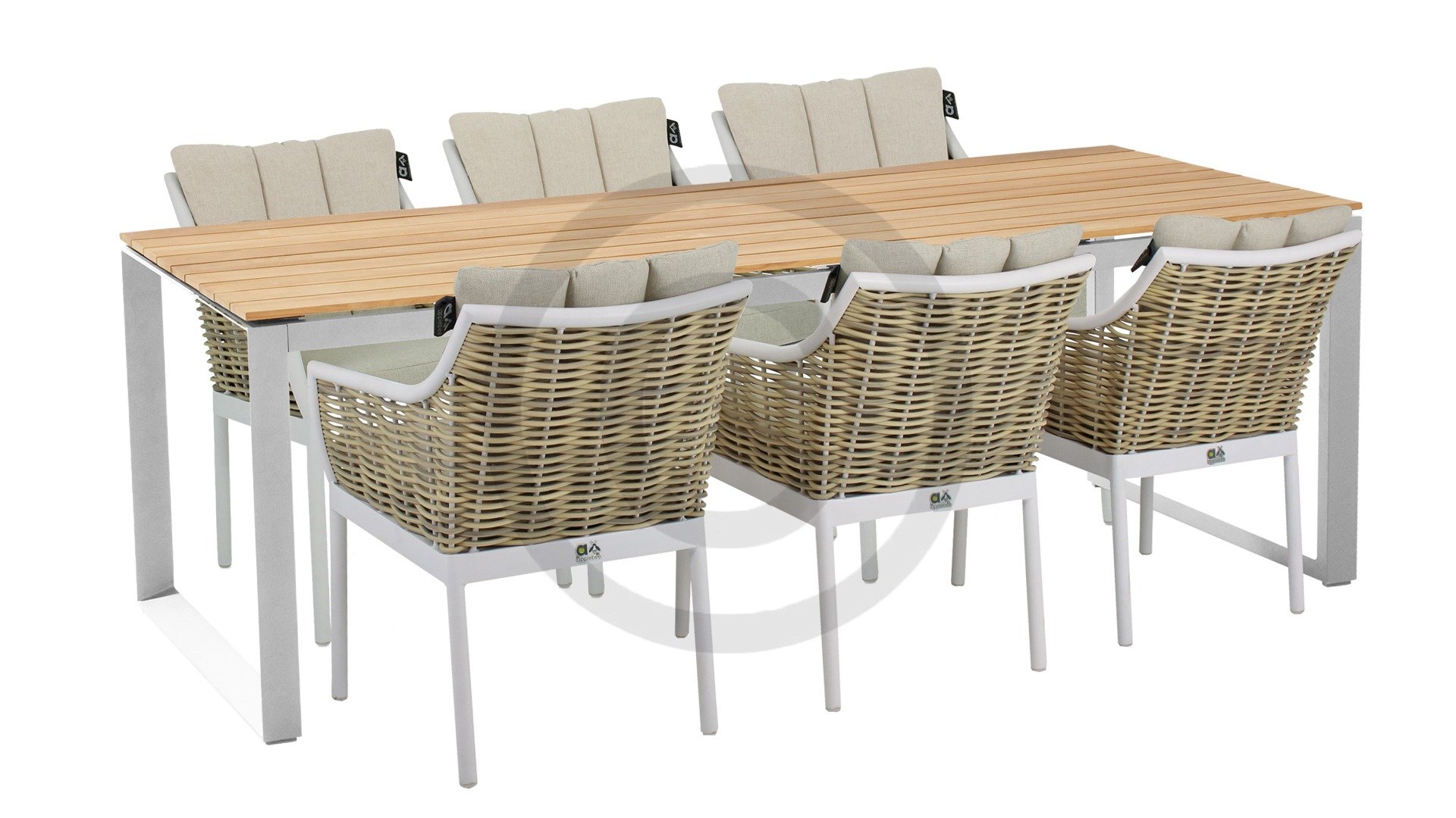 Het uitgesproken succes van de Applebee Milou tuinset Black zorgde voor een grote vraag vanuit de markt naar een bijpassende White dining combinatie. Ontwerper Sako is hiermee aan de slag gegaan en zo ontstond de Applebee Milou White Dining set. De Milou collectie is herkenbaar aan het vlechtwerk, wat bijna gemaakt lijkt van wilgentakken. Bij de premium line zijn de kussens voorzien van Bee Wett® technologie, wat ervoor zorgt dat de kussens weer snel droog zijn na een fikse regenbui. U kunt de kussens dus gewoon buiten laten liggen. De drainage aan de onderzijde van het kussen zorgt er namelijk voor dat het water de kussens eenvoudig kan verlaten. Het extreem dikke vlechtdraad vergt een bijzondere vlechttechniek, die alleen de beste vlechters beheersen. Deze ambachtslieden vlechten iedere draad één voor één handmatig in. U haalt met AppleBee Milou tuinset dus een echt staaltje ambachtskunst in huis. Prachtige combinatie met een teakhouten tafel!