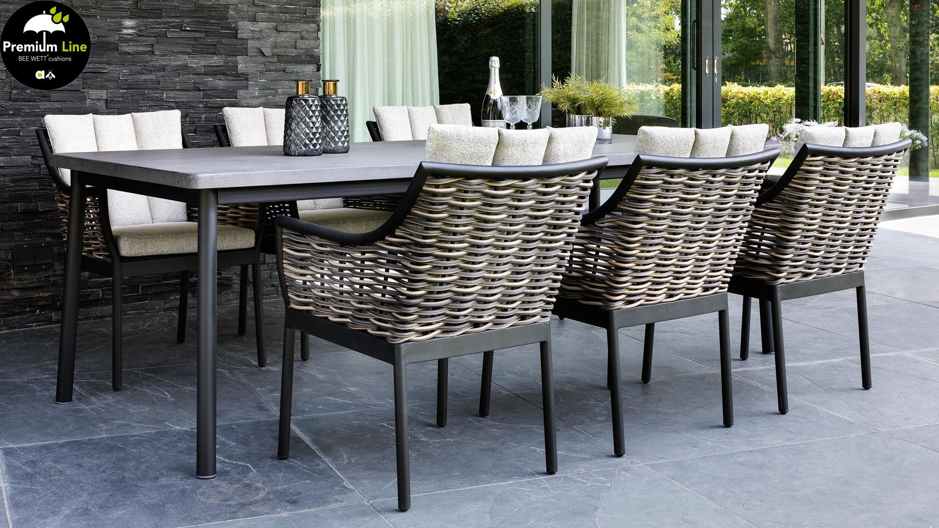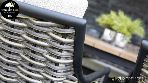 De AppleBee Milou tuinstoel, natuurgetrouw om te zien, maar in de bekende stevige Biculair® buitenkwaliteit die u van Apple Bee gewend bent. Dit vlechtwerk wordt omlijst door een zwart gepoedercoat frame met gebogen lijnen, waaraan tuinset Milou haar chique, moderne look ontleent. Bij de premium line zijn de kussens voorzien van Bee Wett® technologie, wat ervoor zorgt dat de kussens weer snel droog zijn na een fikse regenbui. U kunt de kussens dus gewoon buiten laten liggen. De drainage aan de onderzijde van het kussen zorgt er namelijk voor dat het water de kussens eenvoudig kan verlaten.