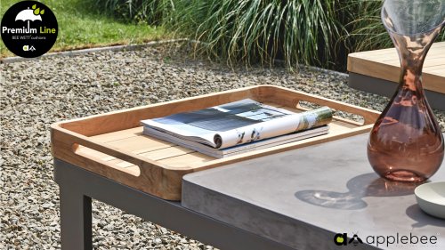 Niet alleen de modulaire opstelling van deze Applebee Mura loungeset is functioneel, maar ook de koffietafel is praktisch ontworpen. Met een lichtgewicht beton tafelblad in het midden wordt de salontafel afgemaakt met twee afneembare teak dienbladen aan de zijkanten. Super handig om bijvoorbeeld eten en drinken te serveren!
