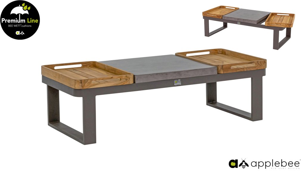Niet alleen de modulaire opstelling van deze Applebee Mura Loungeset is functioneel, maar ook de koffietafel is praktisch ontworpen. Met een lichtgewicht beton tafelblad in het midden wordt de salontafel afgemaakt met twee afneembare teak dienbladen aan de zijkanten. Super handig om bijvoorbeeld eten en drinken te serveren! Of je zet het dienblad met drinken op de bank voor stabiliteit, zodat je lekker in je positie kunt blijven zitten.