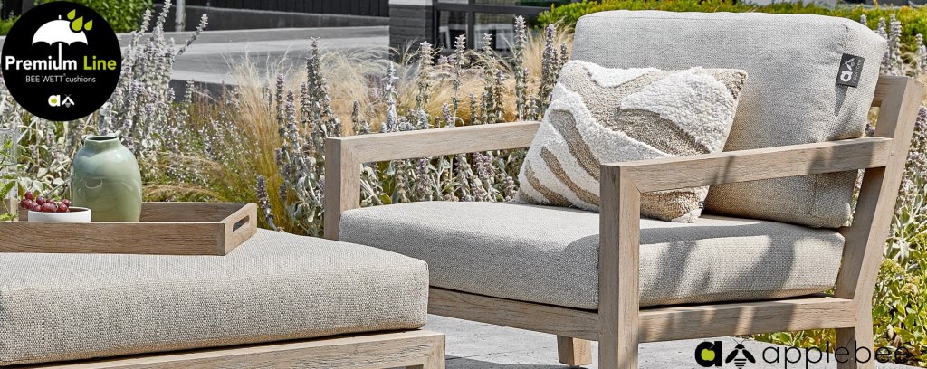 Het hout dat gebruikt wordt is FSC® en SVLK® gecertificeerd. Natuurlijk met de bekende Natural Oak Beewett kussens van AppleBee voor heerlijk gebruiks gemak! AppleBee meubelen worden opgebouwd uit de beste materialen. Dit geldt zeker voor de kussens. BEE WETT zijn speciale weerbestendige kussens. De afneembare hoes wordt gemaakt van de best mogelijke stoffen die alle wasbaar zijn.