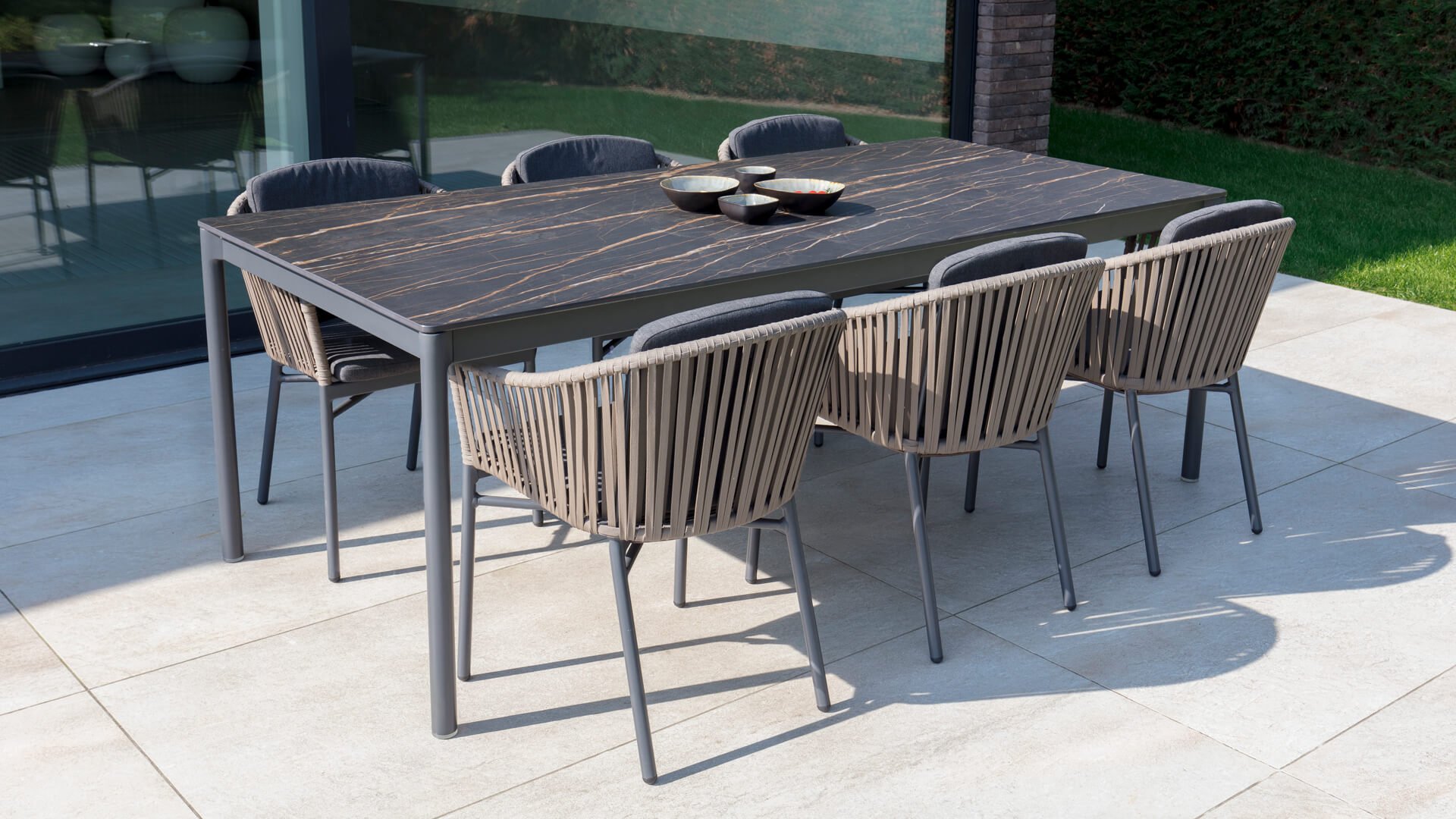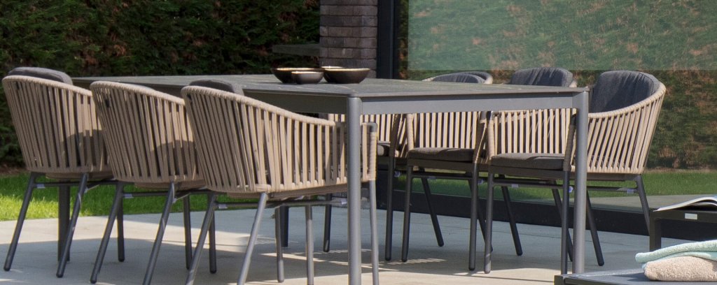 Castle Line Clavo Dining: Aluminium poten, stevig van kwaliteit en erg onderhoudsvriendelijk. Met rope draad in de kleur taupe en het onderstel in antraciete kleur, geeft deze serie een mooie uitstraling. Castle Line is het tuinmeubelmerk dat innoveert. Dat blijkt ook uit de Clavo tuinstoel. Deze is namelijk gemaakt van touw. Het touw is vervolgens gevlochten door en om een aluminium frame. Het touw van de Castle Line Clavo zorgt voor een open structuur en zorgt daarmee voor ruimtelijkheid. Ook zorgt het touw ervoor dat je een echte vintage loungebank hebt.