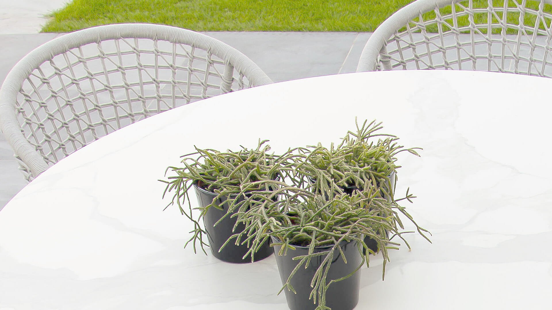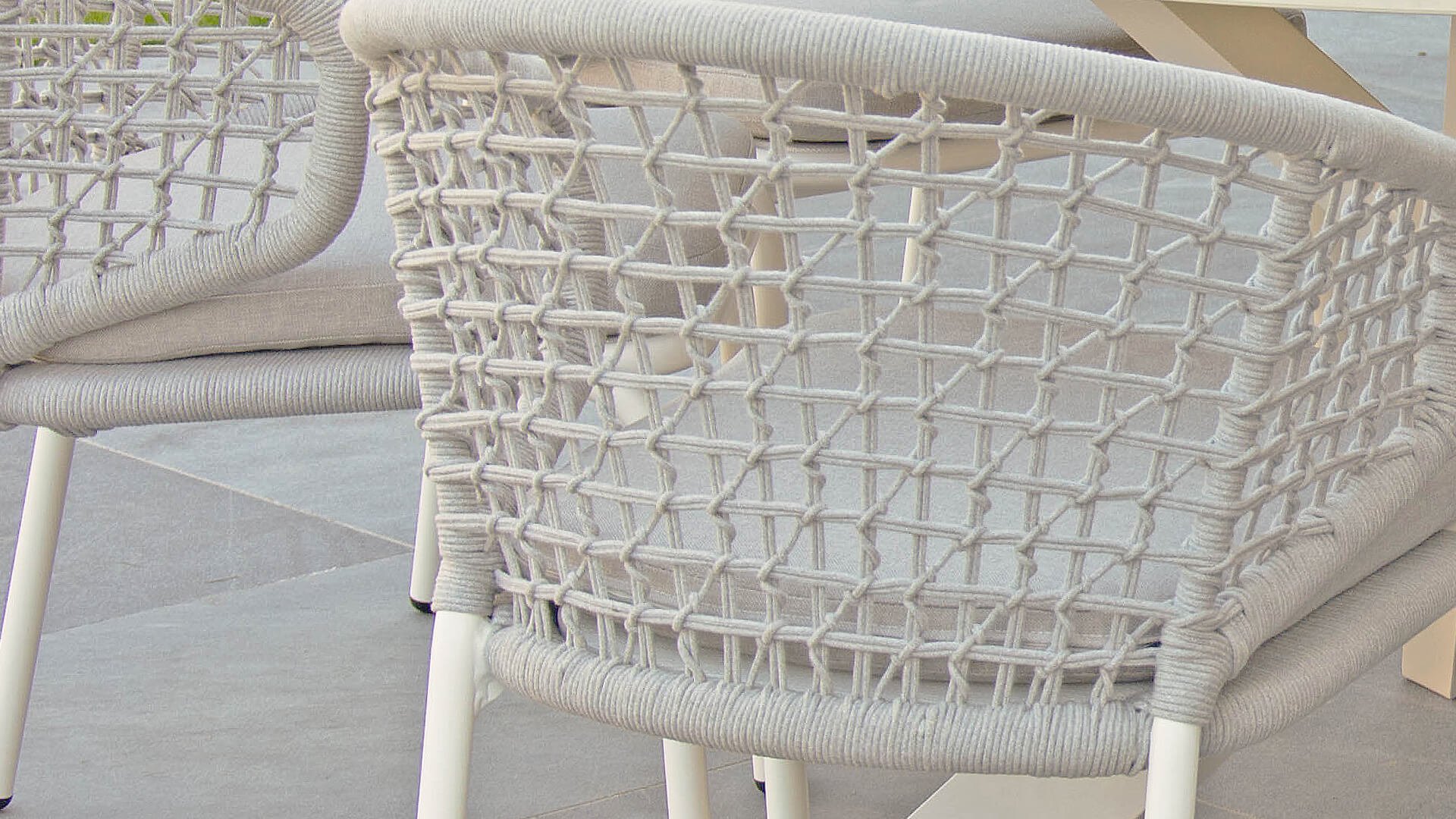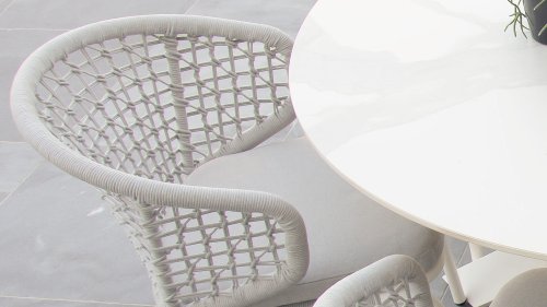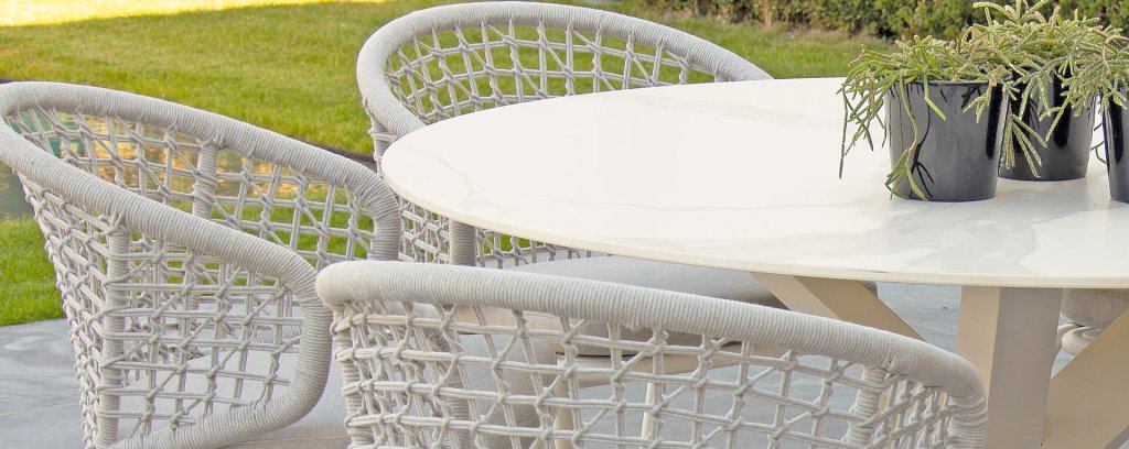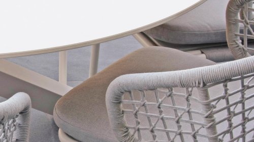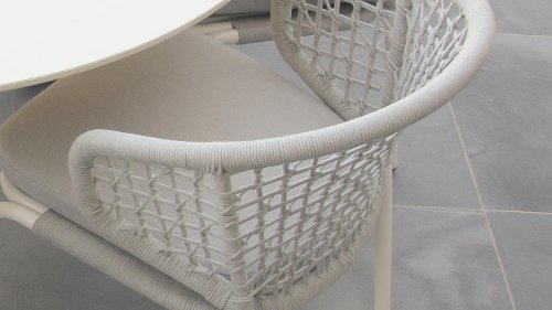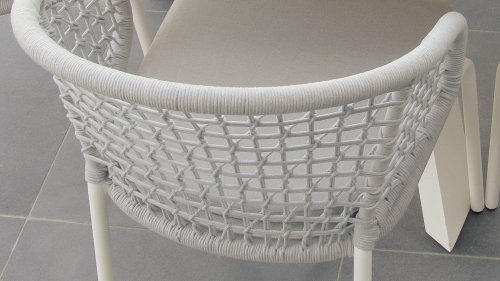 Less is more, binnen onze Rysa Dining serie zijn de tuinmeubelen minimalistisch maar landelijk vormgegeven met vooral functionele eenvoud en sierlijke vormgeving. De prachtige frames zijn gemaakt van aluminium voor optimale weerbestendigheid. Het onderstel is fragiel gevormd maar oersterk, in fris wit ( Ice ) kleur gepoedercoat aluminium. Hetwelk gecombineerd wordt met het prachtige Light Grey kleurige gevlochten rope, geeft een moderne maar toch "warme" uitstraling. De ronde vormen houden dit design helemaal in balans.