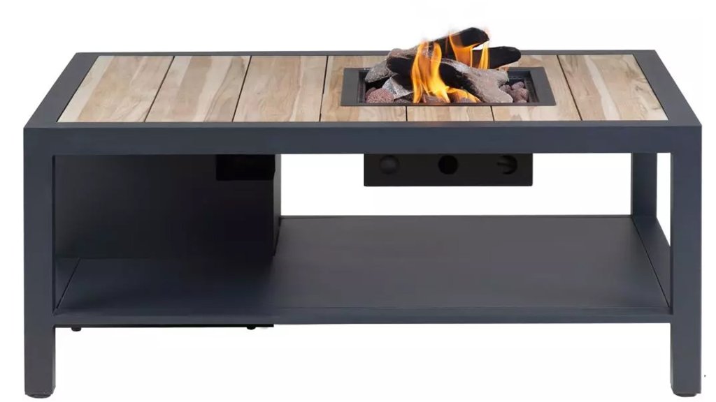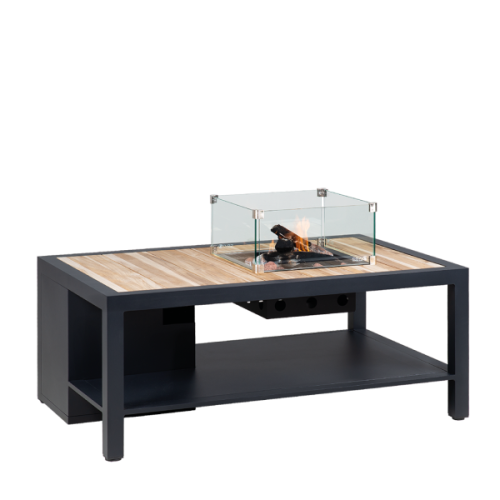 De Cosiflow serie blinkt uit in zijn eenvoud. De Cosiflow is geheel gemaakt van aluminium waardoor je aan deze tafel geen onderhoud hebt. Daarnaast past deze tafel door zijn strakke design bij elke tuinset. Of je nu kiest voor teak, gestoffeerd of kunststof, de Cosiflow matcht altijd. Onder de Cosiflow tafel zit een extra blad om losse spullen te plaatsen. De Cosiflow vuurtafel wordt gebruiksklaar aangeleverd. Dit betekent dat er al een drukregelaar met gasslang, batterij voor de ontsteking, keramische houtstammen en lavastenen meegeleverd.