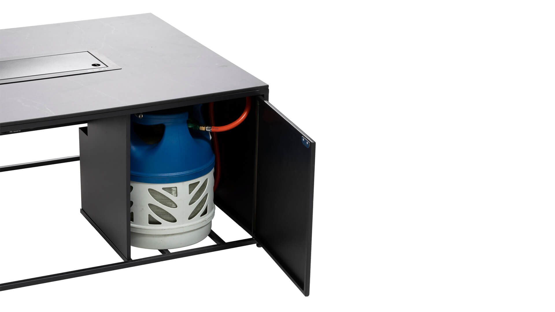 Voor de final touch kan de Cosi worden gecombineerd met verschillende accessoires. De Cosi vuurtafel wordt gebruiksklaar aangeleverd. Dit betekent dat er al een drukregelaar met gasslang, batterij voor de ontsteking, keramische houtstammen en lavastenen meegeleverd. Het enige wat nog nodig is, is een gasfles. In de Cosi passen gasflessen met een maximale hoogte van 40 cm. Dit kunnen de 5 kg gasflessen van bijvoorbeeld Benegas zijn. Wil je de Cosi een extra luxe uitstraling geven? Kies dan voor de Cosi glasset . Deze is perfect op maat te verkrijgen voor jouw Cosi. Bovenop de glasset kan je de Cosi table plate plaatsen om nog meer tafelruimte te creëren voor bijvoorbeeld hapjes en glazen. Let op: deze table plate is alleen te gebruiken als de haard niet in gebruik is. Een Cosi vuurtafel is naar wens uit te breiden met een glasset en / of all weather beschermhoes.