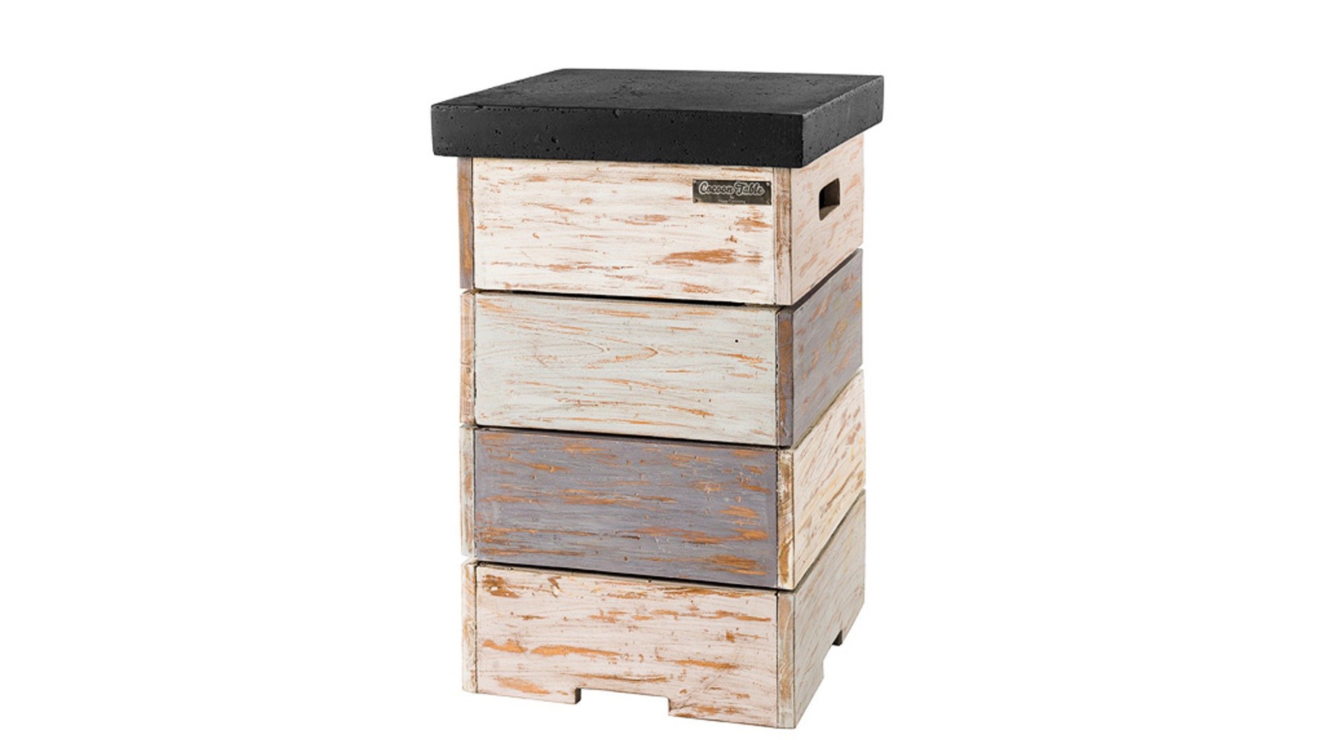 Passend bij de teaktafels van Happy Cocooning, om de gasfles in te doen.